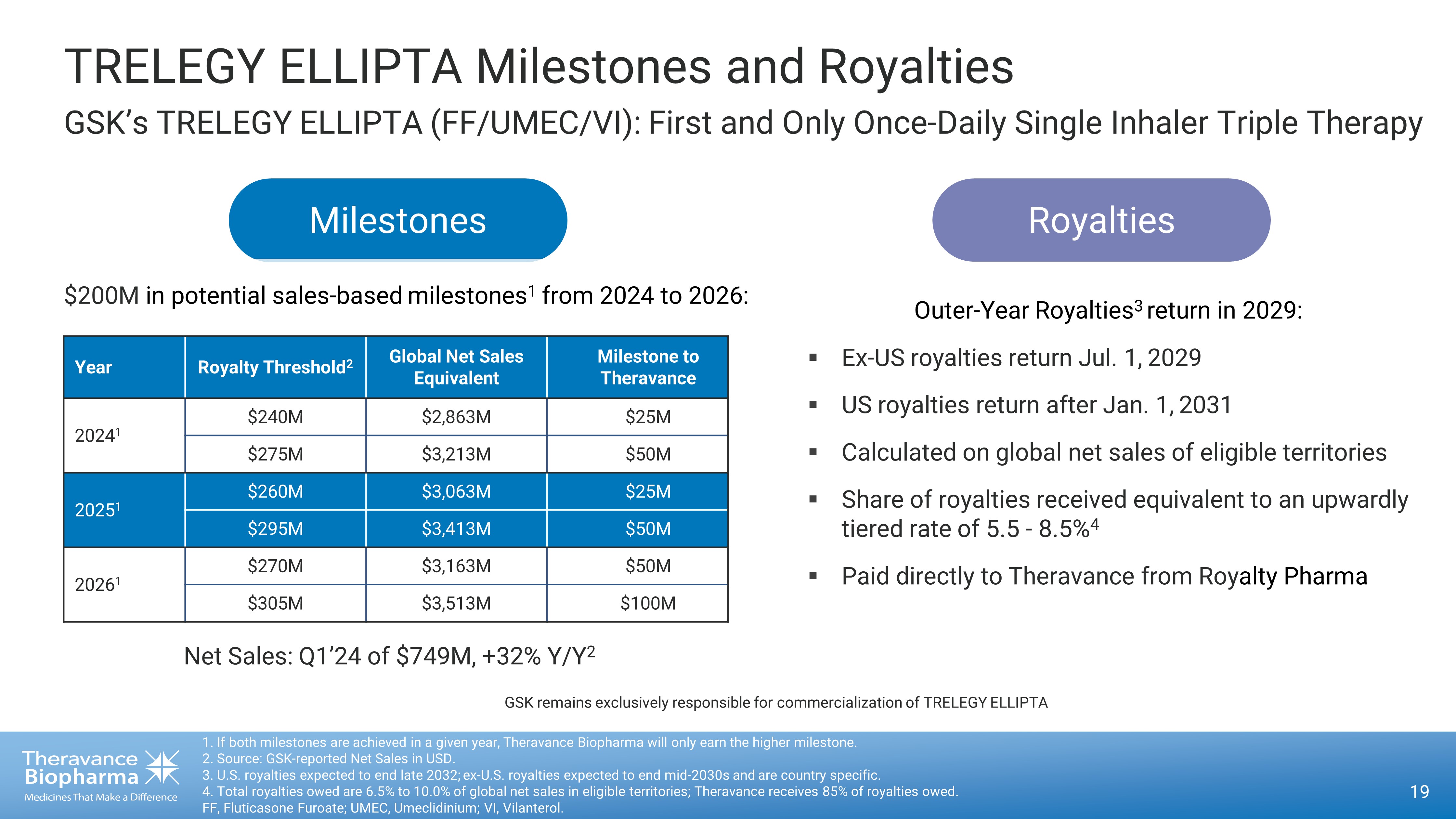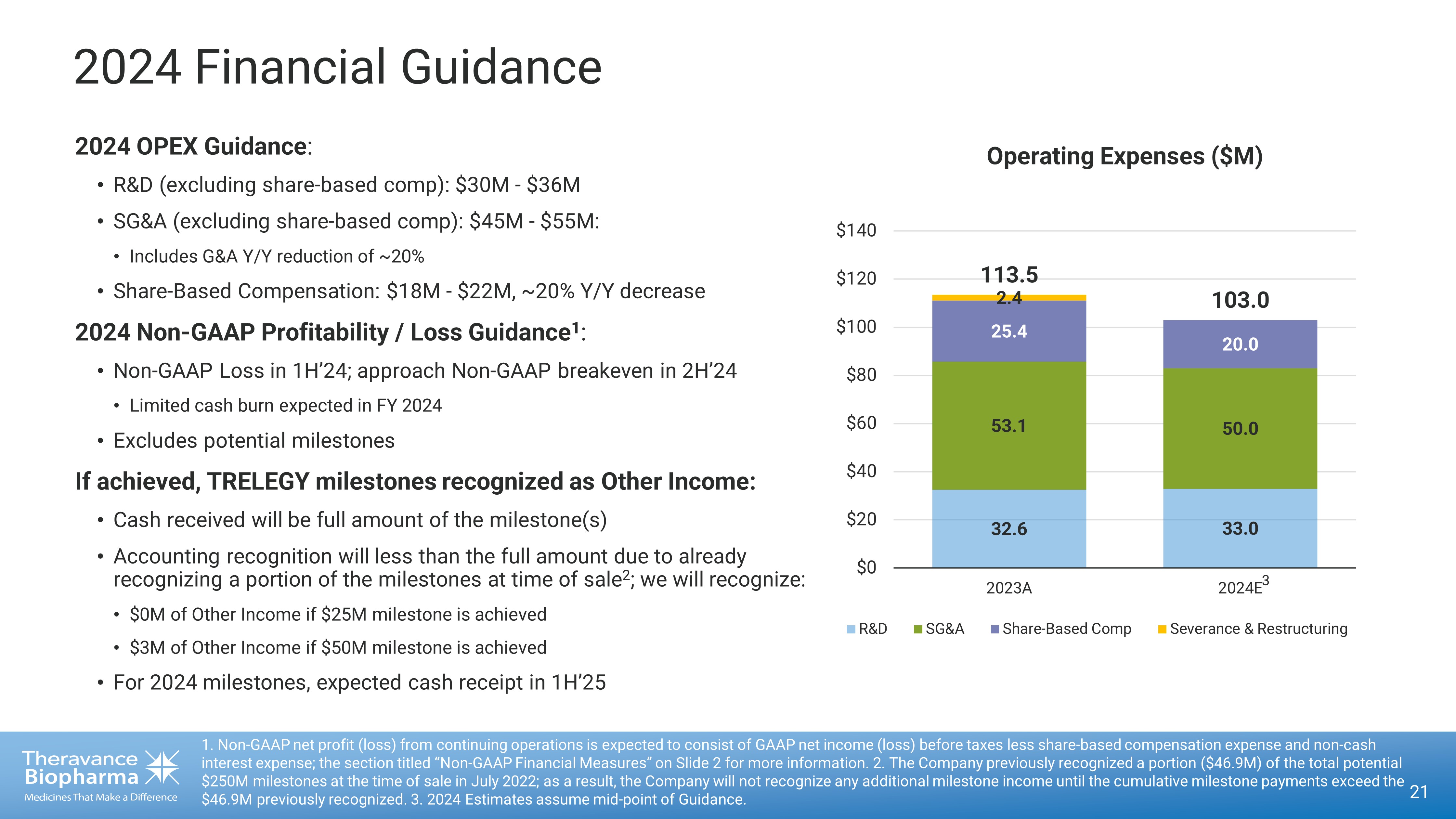 20 1. If both milestones are achieved in a given year, Theravance Biopharma will only earn the higher milestone. 2. GSK - reported Net Sales in USD. 3. Bloomberg Consensus as of 5/10/24. Theravance stands to receive up to $200 million in Trelegy sales milestones paid directly from Royalty Pharma. The first paym ent , of $25 million, will be triggered if Royalty Pharma (RP) receives $240 million or more in royalty payments from GSK based on 2024 TRELEGY global net sales, which we expect would occur should TRELEGY global net sales reach approximately $2.9 billio n. A second payment of $25 million (for a total of $50 million) will be triggered if Royalty Pharma receives $275 million or more in royalty payments from GSK, which we expect would occur should 2024 TRELEGY global net sales exceed approximately $3.2 bi llion. TRELEGY Ellipta Sales Milestones Up to $200 million in milestones from 2024 through 2026 0 500 1,000 1,500 2,000 2,500 3,000 3,500 4,000 ÜÚÜÛ ÜÚÜÜ ÜÚÜÝ 2024 E 2025 E 2026 E Consensus 3 Actuals 2 Net Sales ($M) $1,674 $2,142 $2,739 $3,180 $3,494 $3,700 Threshold to achieve higher 1 milestone tier Threshold to achieve lower milestone tier TRELEGY Global Net Sales ($M) $50M $25M $50M $25M $100M $50M 28% growth 28% growth