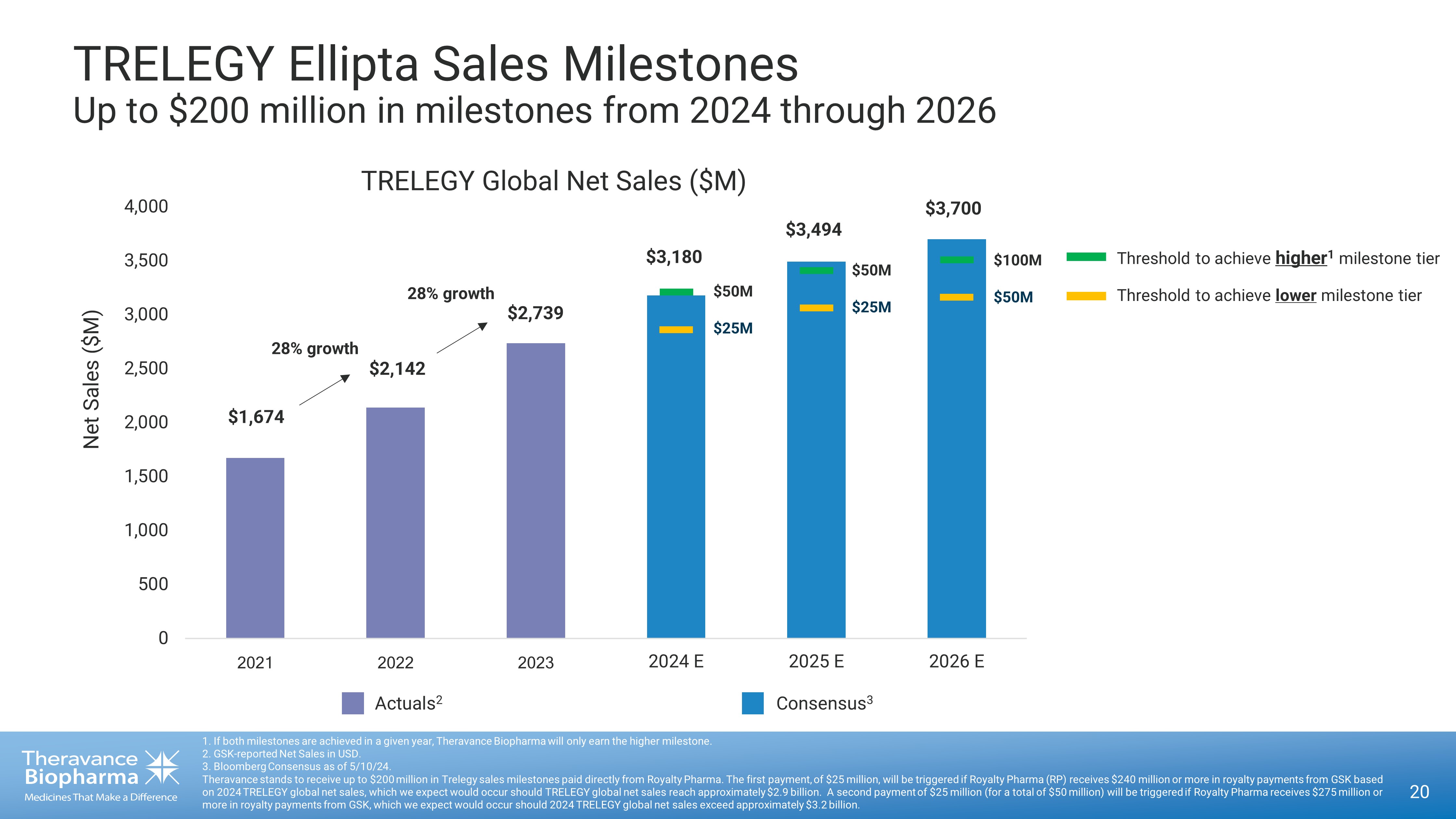 Net Sales: Q1’24 of $749M, +32% Y/Y 2 Outer - Year Royalties 3 return in 2029: ▪ Ex - US royalties return Jul. 1, ௗ 2029 ▪ US royalties return after Jan. 1, ௗ 2031 ▪ Calculated on global net sales of eligible territories ▪ Share of royalties received equivalent to an upwardly tiered rate of 5.5 - 8.5% 4 ▪ Paid directly to Theravance from Roy alty Pharma TRELEGY ELLIPTA Milestones and Royalties GSK’s TRELEGY ELLIPTA (FF/UMEC/VI): First and Only Once - Daily Single Inhaler Triple Therapy 19 1. If both milestones are achieved in a given year, Theravance Biopharma will only earn the higher milestone. 2. Source: GSK - reported Net Sales in USD. 3. U.S. royalties expected to end late 2032; ex - U.S. royalties expected to end mid - 2030s and are country specific. 4. Total royalties owed are 6.5% to 10.0% of global net sales in eligible territories; Theravance receives 85% of royalties o wed . FF, Fluticasone Furoate; UMEC, Umeclidinium; VI, Vilanterol. Milestones Royalties $200M in potential s ales - based milestones 1 from 2024 to 2026: GSK remains exclusively responsible for commercialization of TRELEGY ELLIPTA Year Royalty Threshold 2 Global Net Sales Equivalent Milestone to Theravance 2024 1 $240M $2,863M $25M $275M $3,213M $50M 2025 1 $260M $3,063M $25M $295M $3,413M $50M 2026 1 $270M $3,163M $50M $305M $3,513M $100M