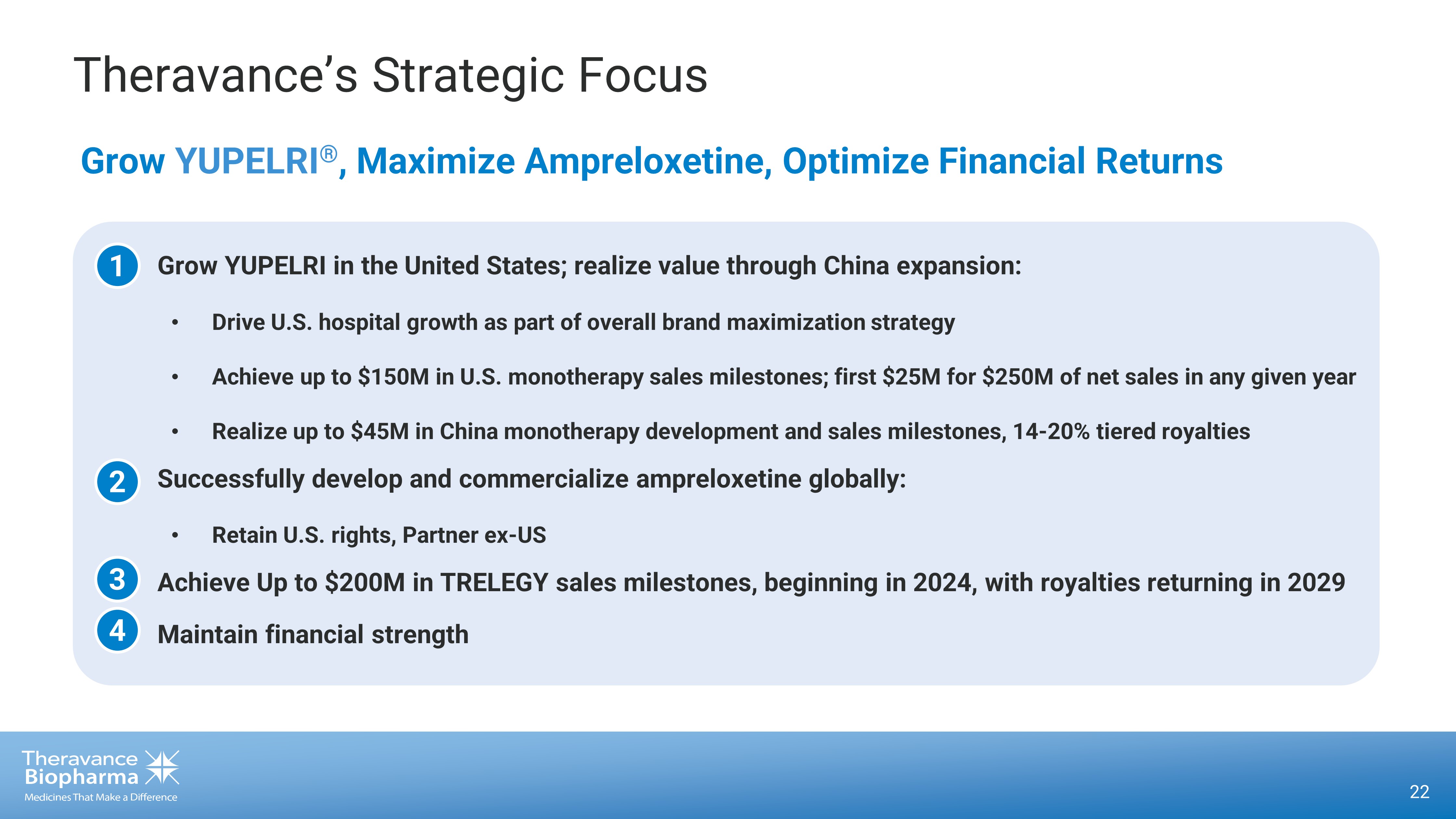 22 Theravance’s Strategic Focus • Grow YUPELRI in the United States; realize value through China expansion: • Drive U.S. hospital growth as part of overall brand maximization strategy • Achieve up to $150M in U.S. monotherapy sales milestones; first $25M for $250M of net sales in any given year • Realize up to $45M in China monotherapy development and sales milestones, 14 - 20% tiered royalties • Successfully develop and commercialize ampreloxetine globally: • Retain U.S. rights, Partner ex - US • Achieve Up to $200M in TRELEGY sales milestones, beginning in 2024, with royalties returning in 2029 • Maintain financial strength Grow YUPELRI ® , Maximize Ampreloxetine, Optimize Financial Returns 1 2 3 4
