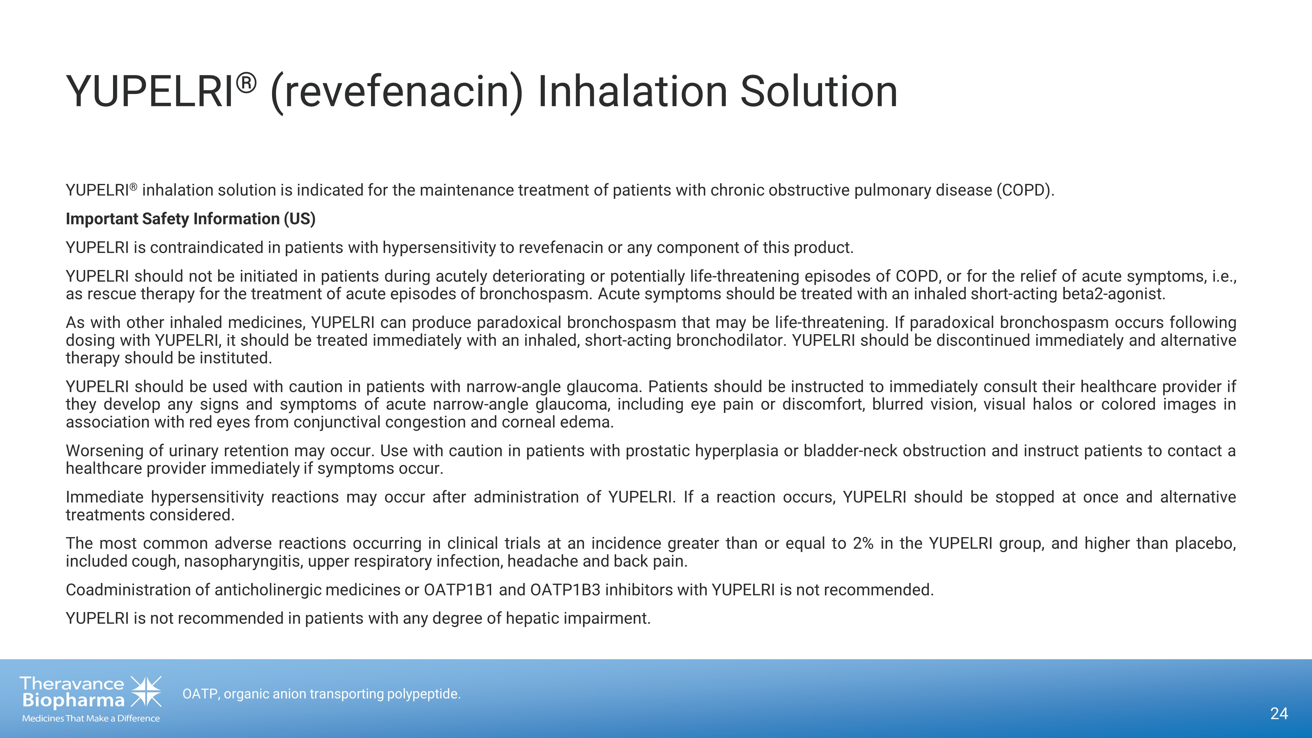 YUPELRI ® (revefenacin) Inhalation Solution YUPELRI ® inhalation solution is indicated for the maintenance treatment of patients with chronic obstructive pulmonary disease (COPD) . Important Safety Information (US) YUPELRI is contraindicated in patients with hypersensitivity to revefenacin or any component of this product . YUPELRI should not be initiated in patients during acutely deteriorating or potentially life - threatening episodes of COPD, or for the relief of acute symptoms, i . e . , as rescue therapy for the treatment of acute episodes of bronchospasm . Acute symptoms should be treated with an inhaled short - acting beta 2 - agonist . As with other inhaled medicines, YUPELRI can produce paradoxical bronchospasm that may be life - threatening . If paradoxical bronchospasm occurs following dosing with YUPELRI, it should be treated immediately with an inhaled, short - acting bronchodilator . YUPELRI should be discontinued immediately and alternative therapy should be instituted . YUPELRI should be used with caution in patients with narrow - angle glaucoma . Patients should be instructed to immediately consult their healthcare provider if they develop any signs and symptoms of acute narrow - angle glaucoma, including eye pain or discomfort, blurred vision, visual halos or colored images in association with red eyes from conjunctival congestion and corneal edema . Worsening of urinary retention may occur . Use with caution in patients with prostatic hyperplasia or bladder - neck obstruction and instruct patients to contact a healthcare provider immediately if symptoms occur . Immediate hypersensitivity reactions may occur after administration of YUPELRI . If a reaction occurs, YUPELRI should be stopped at once and alternative treatments considered . The most common adverse reactions occurring in clinical trials at an incidence greater than or equal to 2 % in the YUPELRI group, and higher than placebo, included cough, nasopharyngitis, upper respiratory infection, headache and back pain . Coadministration of anticholinergic medicines or OATP 1 B 1 and OATP 1 B 3 inhibitors with YUPELRI is not recommended . YUPELRI is not recommended in patients with any degree of hepatic impairment . 24 OATP, organic anion transporting polypeptide.
