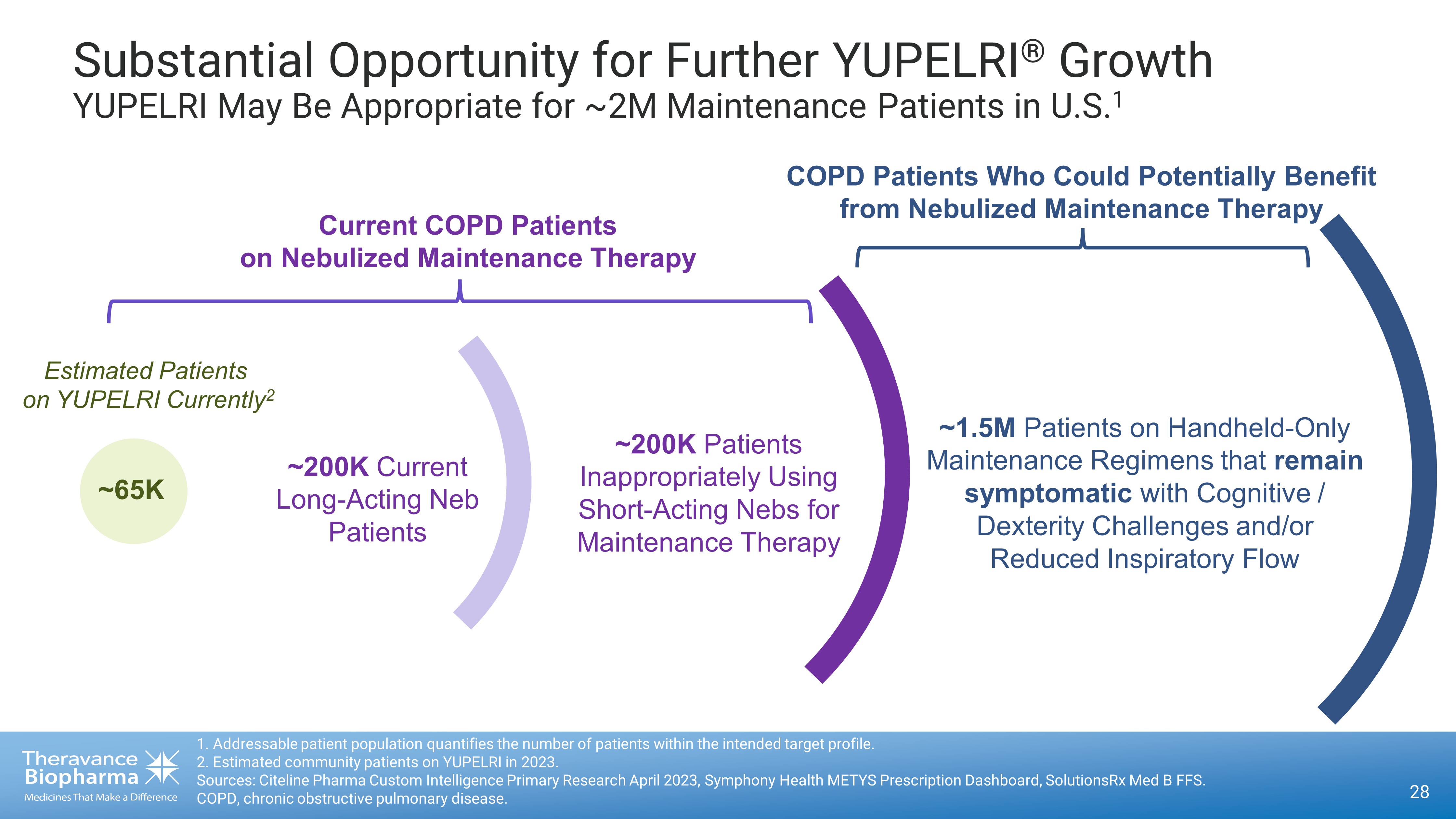 About YUPELRI ® (revefenacin) Inhalation Solution YUPELRI ® (revefenacin) inhalation solution is a once - daily nebulized LAMA approved for the maintenance treatment of COPD in the US . Market research by Theravance Biopharma indicates approximately 9 % of the treated COPD patients in the US use nebulizers for ongoing maintenance therapy . 1 LAMAs are a cornerstone of maintenance therapy for COPD and YUPELRI ® is positioned as the first once - daily single - agent bronchodilator product for COPD patients who require, or prefer, nebulized therapy . YUPELRI ® ’s stability in both metered dose inhaler and dry powder device formulations suggest that this LAMA could also serve as a foundation for novel handheld combination products . 25 1. TBPH market research (N=160 physicians); refers to US COPD patients. COPD, chronic obstructive pulmonary disease; LAMA, long - acting muscarinic antagonist.