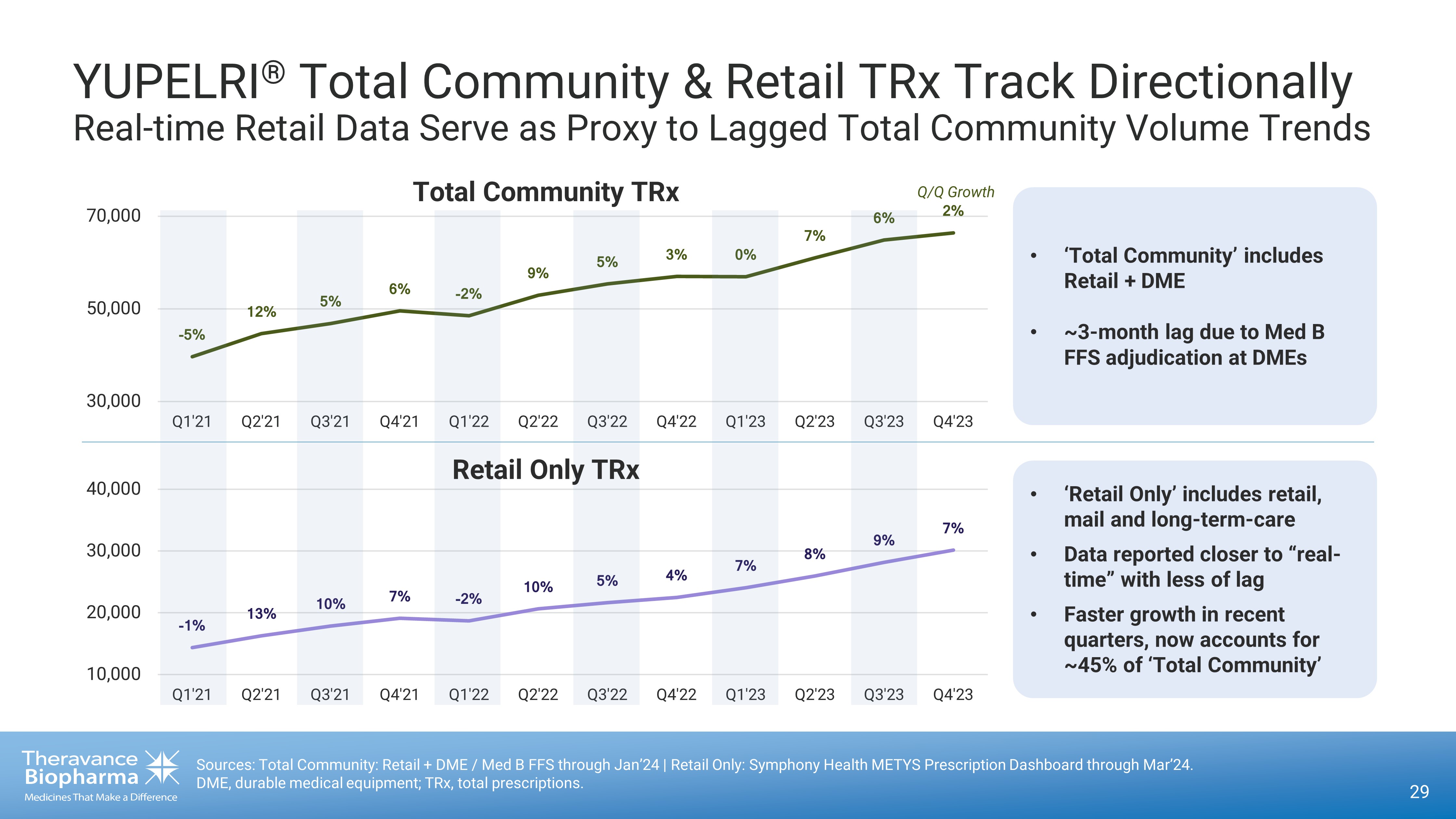 29 × ß Ï ÛÜ Ï ß Ï à Ï × Ü Ï ã Ï ß Ï Ý Ï Ú Ï á Ï à Ï Ü Ï 30,000 50,000 70,000 Q1'21 Q2'21 Q3'21 Q4'21 Q1'22 Q2'22 Q3'22 Q4'22 Q1'23 Q2'23 Q3'23 Q4'23 Total Community TRx × Û Ï ÛÝ Ï ÛÚ Ï á Ï × Ü Ï ÛÚ Ï ß Ï Þ Ï á Ï â Ï ã Ï á Ï 10,000 20,000 30,000 40,000 Q1'21 Q2'21 Q3'21 Q4'21 Q1'22 Q2'22 Q3'22 Q4'22 Q1'23 Q2'23 Q3'23 Q4'23 • ‘Total Community’ includes Retail + DME • ~3 - month lag due to Med B FFS adjudication at DMEs Retail Only TRx • ‘Retail Only’ includes retail, mail and long - term - care • Data reported closer to “real - time” with less of lag • Faster growth in recent quarters, now accounts for ~45% of ‘Total Community’ Q /Q Growth Sources: Total Community: Retail + DME / Med B FFS through Jan’24 | Retail Only: Symphony Health METYS Prescription Dashboard through Mar’24. DME, durable medical equipment; TRx, total prescriptions. YUPELRI ® Total Community & Retail TRx Track Directionally Real - time Retail Data Serve as Proxy to Lagged Total Community Volume Trends