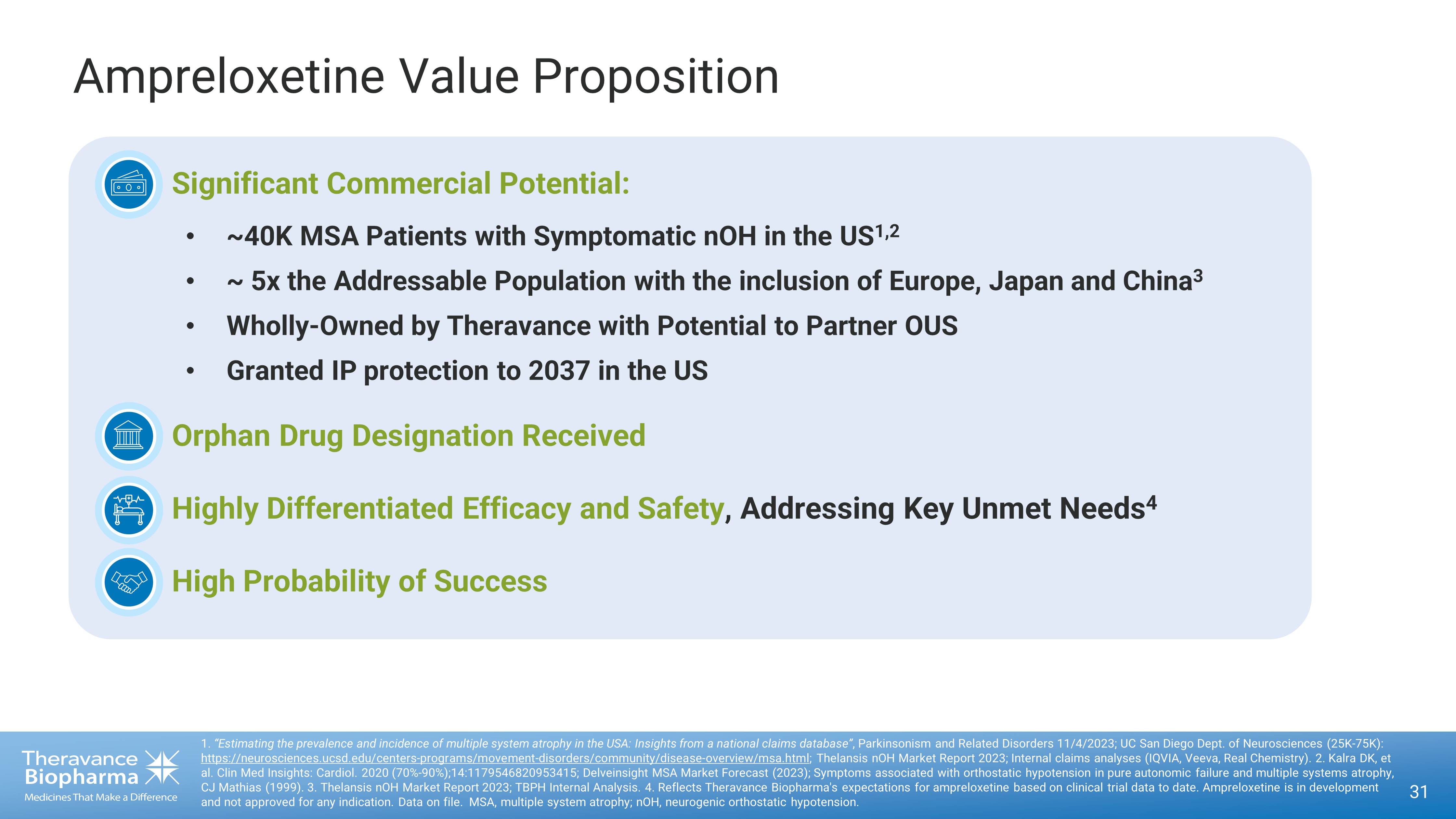 MSA Prevalence in the United States: ~50K Patients Recent Data C onfirm S ignificant P opulation with Unmet N eeds 1. Fanciulli A, Wenning GK. N Eng J Med 2015:372:249 – 63. 2. “Estimating the prevalence and incidence of multiple system atrophy in the USA: Insights from a national claims database” , Parkinsonism and Related Disorders 11/4/2023. 3. UC San Diego Dept. of Neurosciences (25K - 75K): https://neurosciences.ucsd.edu/centers - programs/movement - disorders/community/disease - overview/msa.html ; Thelansis nOH Market Report 2023 ; Internal claims analyses (IQVIA, Veeva, Real Chemistry). 4. Kalra DK, et al. Clin Med Insights: Cardiol. 2020 (70% - 90%);14:1179546820953415. 5. Delveinsight MSA Market Forecast (2023); Sy mptoms associated with orthostatic hypotension in pure autonomic failure and multiple systems atrophy, CJ Mathias (1999). MSA, multiple system atrophy; nOH, neurogenic orthostatic hypotension. ~14K MSA Patients: Outdated View MSA Patients: Real - World Data ~50K Outdated estimates of MSA prevalence rely on limited reviews of health care practice data or door - to - door surveys 1,2 UCSD Dept. of Neurosciences estimates 50K MSA patients 1 ; multiple U.S. claims analyses support this approximation 2,3 MSA Patients w/ nOH ~40K Ampreloxetine’s addressable p opulation: ~80% of MSA patients with symptomatic nOH 4,5 32