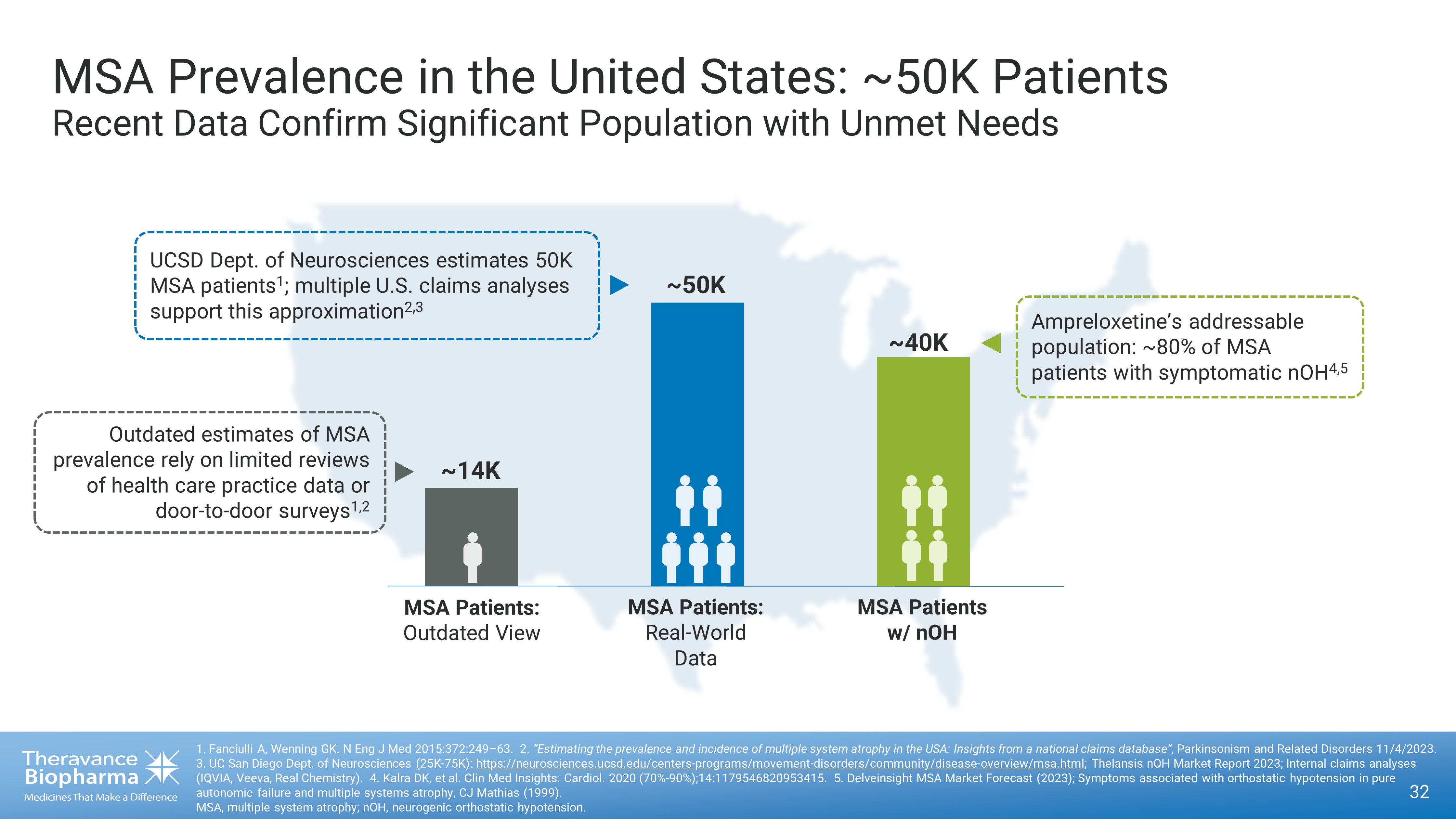 Ampreloxetine Value Proposition 31 1. “Estimating the prevalence and incidence of multiple system atrophy in the USA: Insights from a national claims database” , Parkinsonism and Related Disorders 11/4/2023; UC San Diego Dept. of Neurosciences (25K - 75K): https://neurosciences.ucsd.edu/centers - programs/movement - disorders/community/disease - overview/msa.html ; Thelansis nOH Market Report 2023 ; Internal claims analyses (IQVIA, Veeva, Real Chemistry). 2. Kalra DK, et al. Clin Med Insights: Cardiol. 2020 (70% - 90%);14:1179546820953415; Delveinsight MSA Market Forecast (2023); Symptoms associated with orthostatic hypotension in pure autonomic failure and multiple systems atrophy, CJ Mathias (1999). 3. Thelansis nOH Market Report 2023; TBPH Internal Analysis. 4. Reflects Theravance Biopharma's expectations for ampreloxetine based on clinical trial data to date. Ampreloxetine is in d eve lopment and not approved for any indication. Data on file. MSA, multiple system atrophy; nOH, neurogenic orthostatic hypotension. • Significant Commercial Potential: • ~40K MSA Patients with Symptomatic nOH in the US 1,2 • ~ 5x the Addressable Population with the inclusion of Europe, Japan and China 3 • Wholly - Owned by Theravance with Potential to Partner OUS • Granted IP protection to 2037 in the US • Orphan Drug Designation Received • Highly Differentiated Efficacy and Safety , Addressing Key Unmet Needs 4 • High Probability of Success
