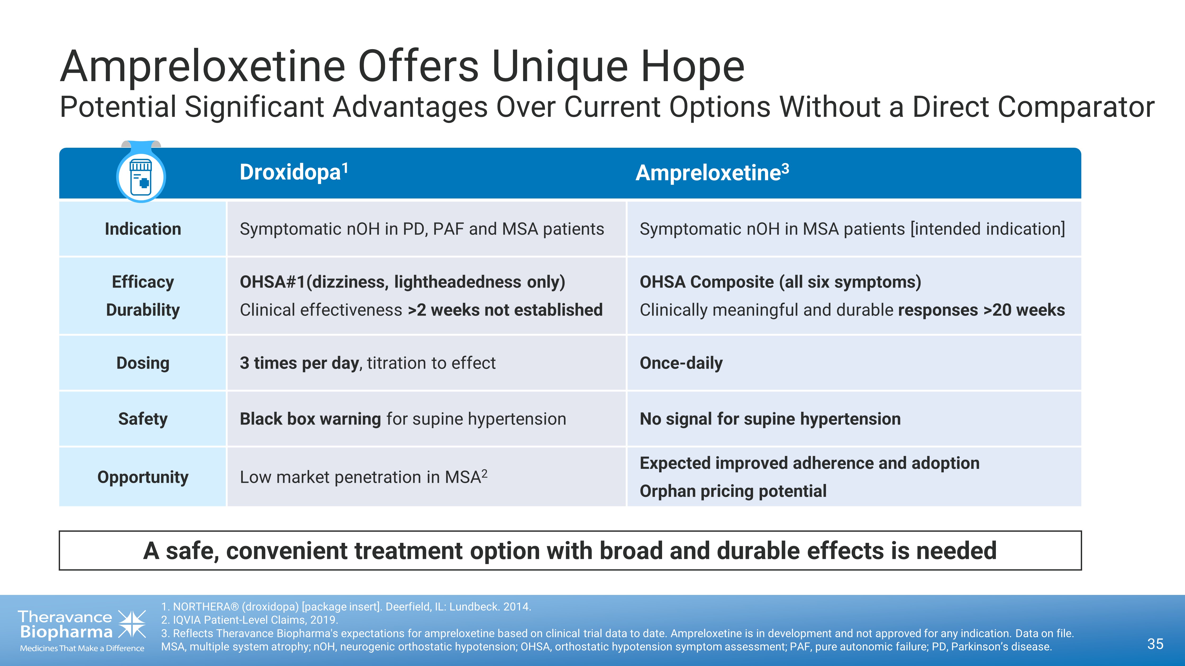 Droxidopa Ampreloxetine Indication Symptomatic nOH in PD, PAF and MSA patients Symptomatic nOH in MSA patients [intended indication] Efficacy Durability OHSA#1(dizziness, lightheadedness only) Clinical effectiveness >2 weeks not established OHSA Composite (all six symptoms) Clinically meaningful and durable responses >20 weeks Dosing 3 times per day , titration to effect Once - daily Safety Black box warning for supine hypertension No signal for supine hypertension Opportunity Low market penetration in MSA 2 Expected improved adherence and adoption Orphan pricing potential Ampreloxetine Offers Unique Hope Potential Significant Advantages Over Current Options Without a Direct Comparator 35 1. NORTHERA® (droxidopa) [package insert]. Deerfield, IL: Lundbeck. 2014. 2. IQVIA Patient - Level Claims, 2019. 3. Reflects Theravance Biopharma's expectations for ampreloxetine based on clinical trial data to date. Ampreloxetine is in d eve lopment and not approved for any indication. Data on file. MSA, multiple system atrophy; nOH, neurogenic orthostatic hypotension; OHSA, orthostatic hypotension symptom assessment; PAF, pure autonomic failure; PD, Parkinson’s disease. Droxidopa 1 Ampreloxetine 3 A safe, convenient treatment option with broad and durable effects is needed