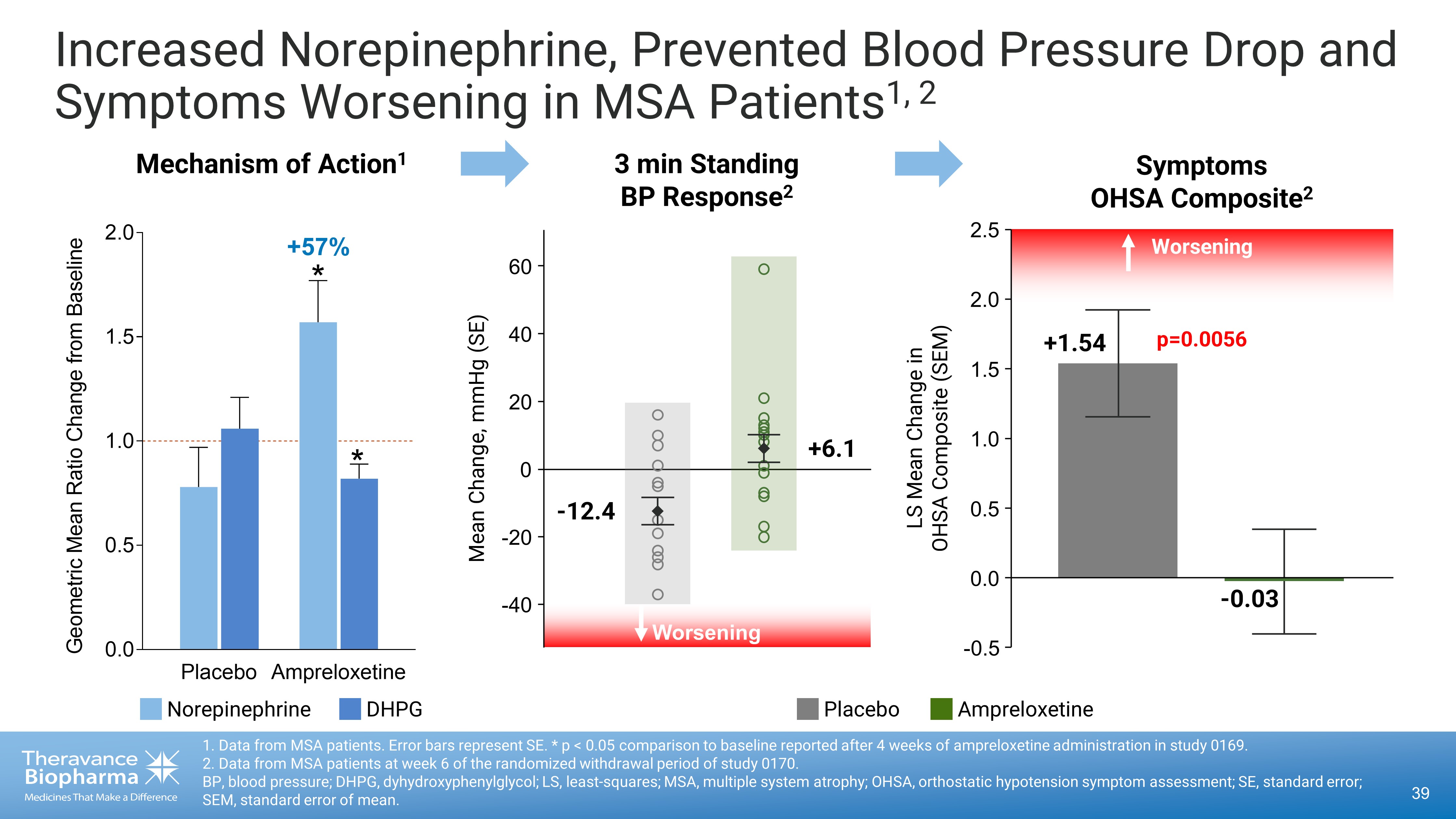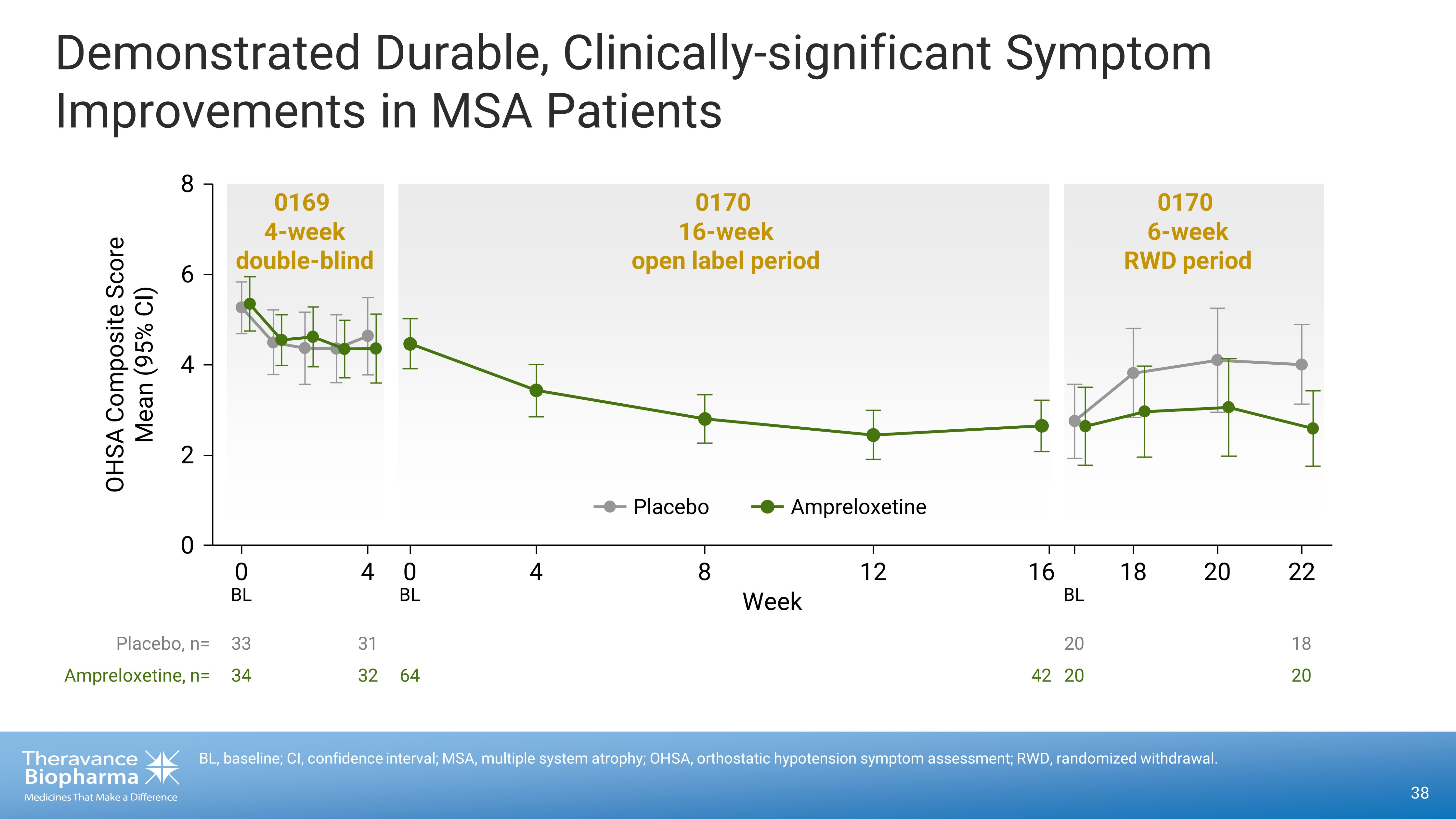38 BL, baseline; CI, confidence interval; MSA, multiple system atrophy; OHSA, orthostatic hypotension symptom assessment; RWD, r and omized withdrawal. Demonstrated Durable, Clinically - significant Symptom Improvements in MSA Patients 33 34 31 32 64 42 20 20 18 20 0 0 4 0 4 8 12 16 18 20 22 2 4 6 8 0169 4 - week double - blind 0170 6 - week RWD period 0170 16 - week open label period Placebo, n= Ampreloxetine, n= Week OHSA Composite Score Mean (95% CI) BL BL BL Ampreloxetine Placebo