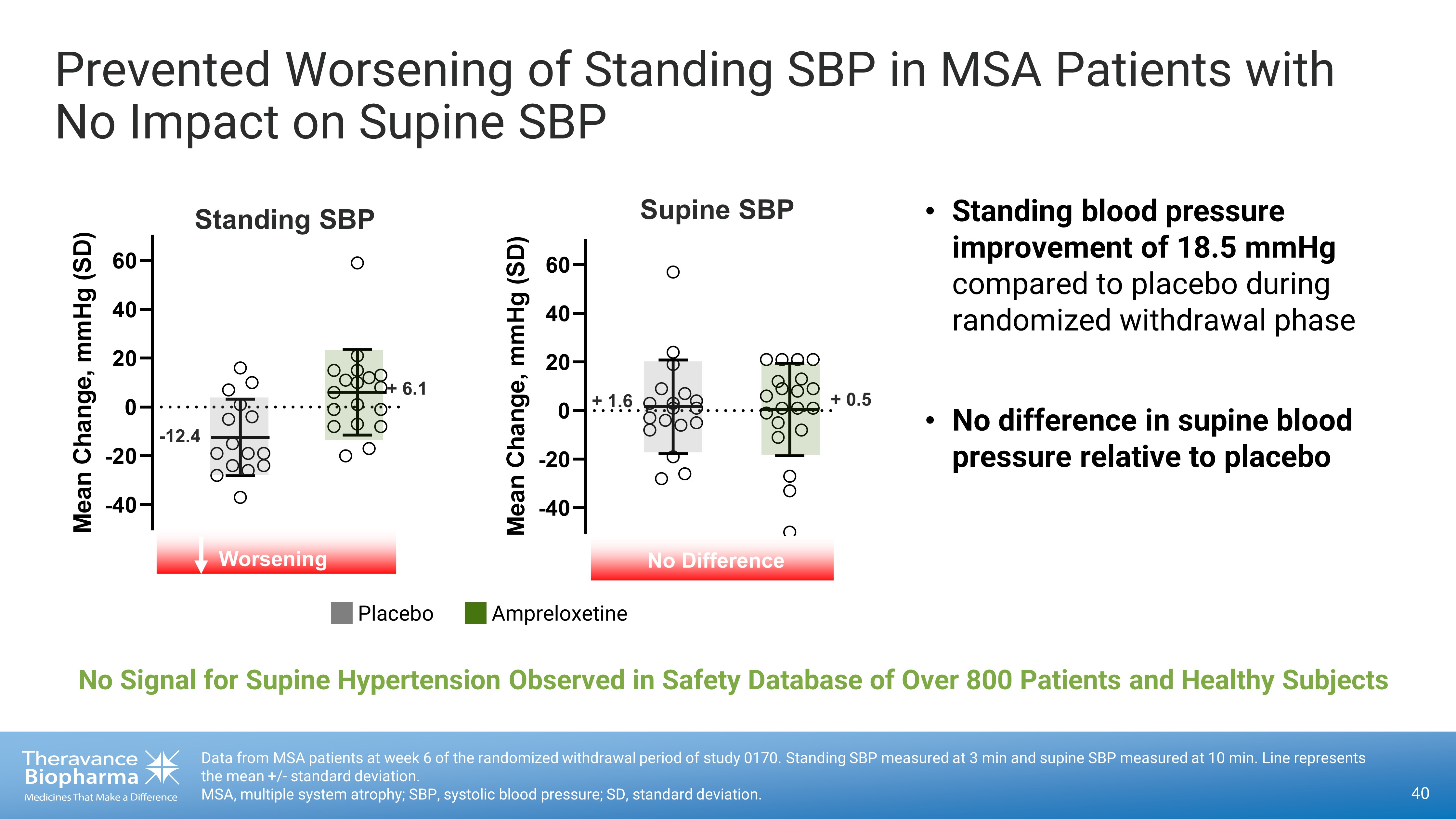 Increased Norepinephrine, Prevented Blood Pressure Drop and Symptoms Worsening in MSA Patients 1, 2 39 1. Data from MSA patients. Error bars represent SE. * p < 0.05 comparison to baseline reported after 4 weeks of ampreloxetine ad ministration in study 0169. 2. Data from MSA patients at week 6 of the randomized withdrawal period of study 0170. BP, blood pressure; DHPG, dyhydroxyphenylglycol; LS, least - squares; MSA, multiple system atrophy; OHSA, orthostatic hypotension symptom assessment; SE, standard error; SEM, standard error of mean. Placebo Ampreloxetine 0.0 0.5 1.0 1.5 2.0 G e o m e t r i c M e a n R a t i o C h a n g e f r o m B a s e l i n e Mechanism of Action 1 3 min Standing BP Response 2 * * +57% - 0.03 p=0.0056 LS Mean Change in OHSA Composite (SEM) Worsening +1.54 Symptoms OHSA Composite 2 0.0 - 0.5 0.5 1.0 1.5 2.0 2.5 - 40 - 20 0 20 40 60 Worsening - 12.4 +6.1 Mean Change, mmHg (SE) Placebo Ampreloxetine Norepinephrine DHPG