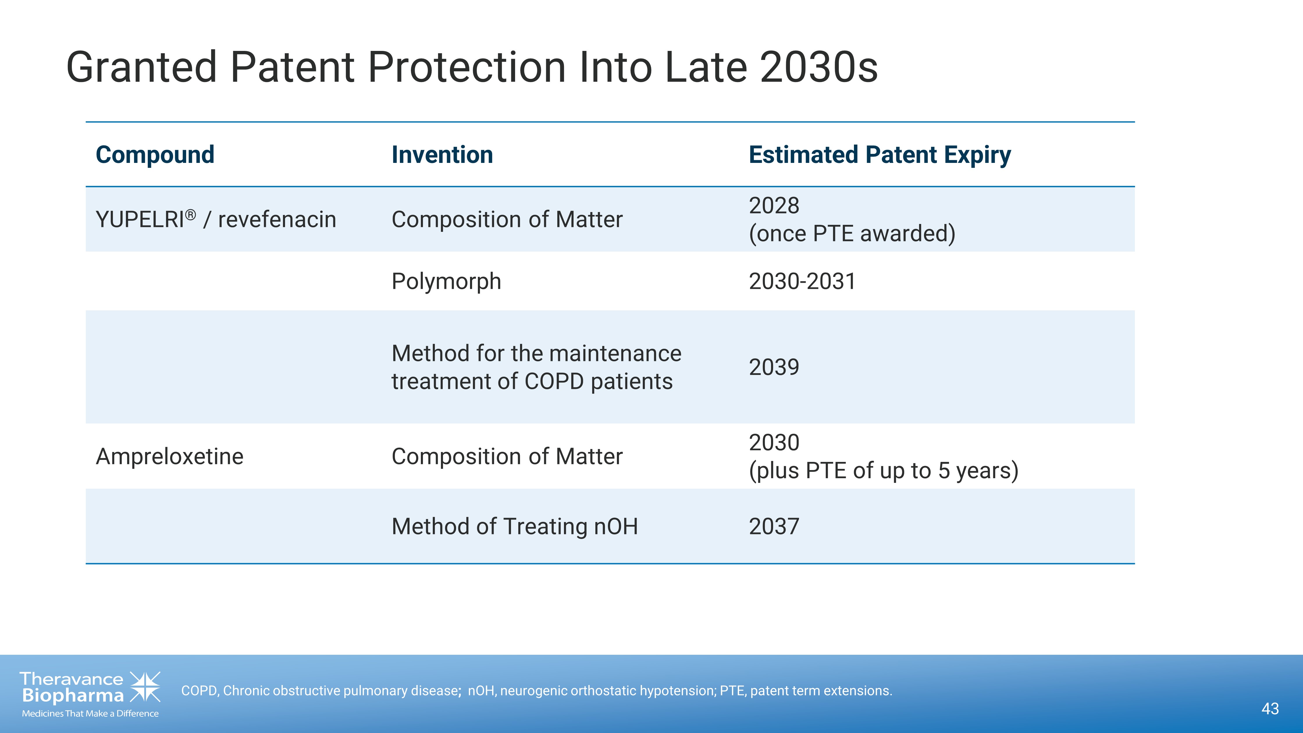 Granted Patent Protection Into Late 2030s 43 COPD, Chronic obstructive pulmonary disease ; nOH, neurogenic orthostatic hypotension; PTE, patent term extensions. Compound Invention Estimated Patent Expiry YUPELRI ® / revefenacin Composition of Matter 2028 (once PTE awarded) Polymorph 2030 - 2031 Method for the maintenance treatment of COPD patients 2039 Ampreloxetine Composition of Matter 2030 (plus PTE of up to 5 years) Method of Treating nOH 2037