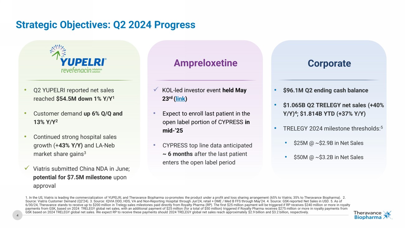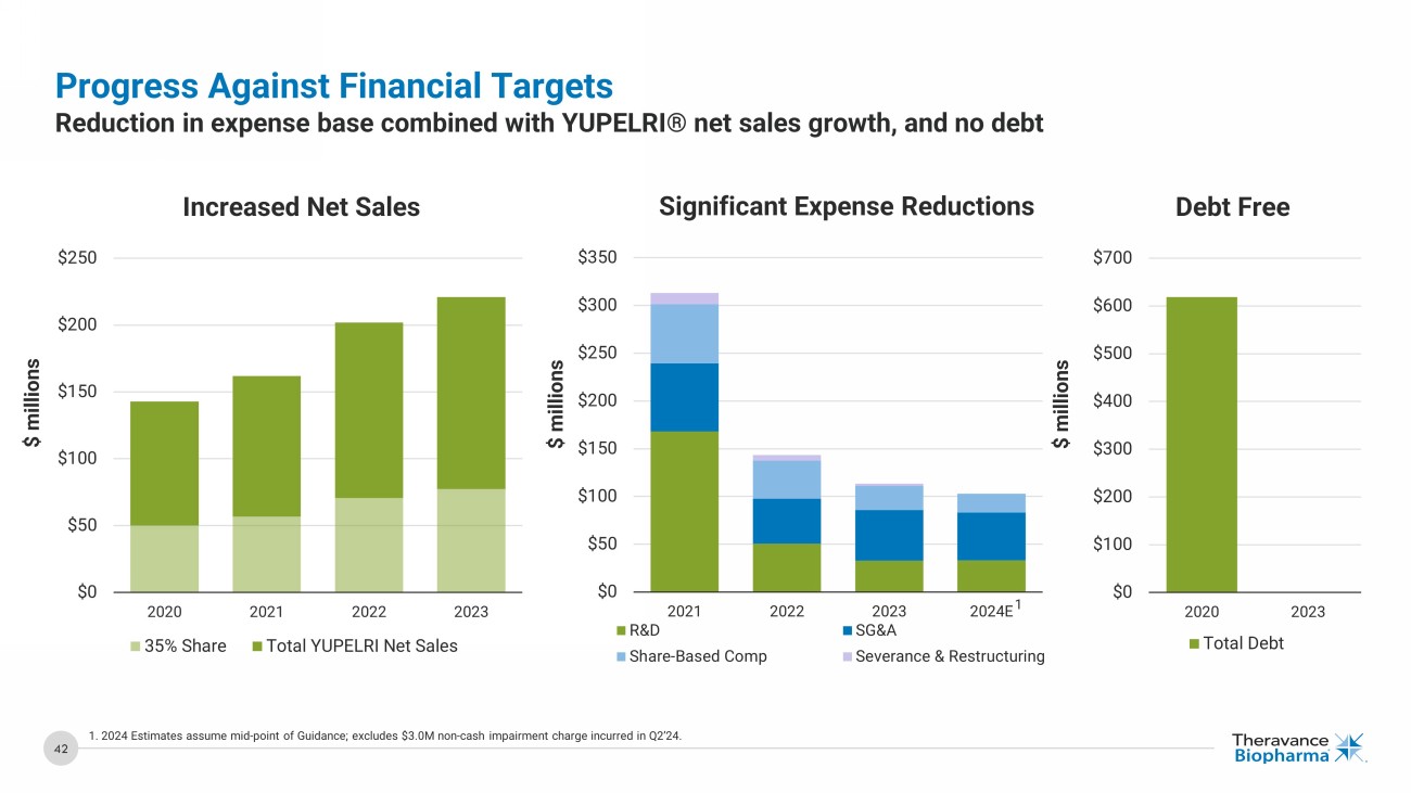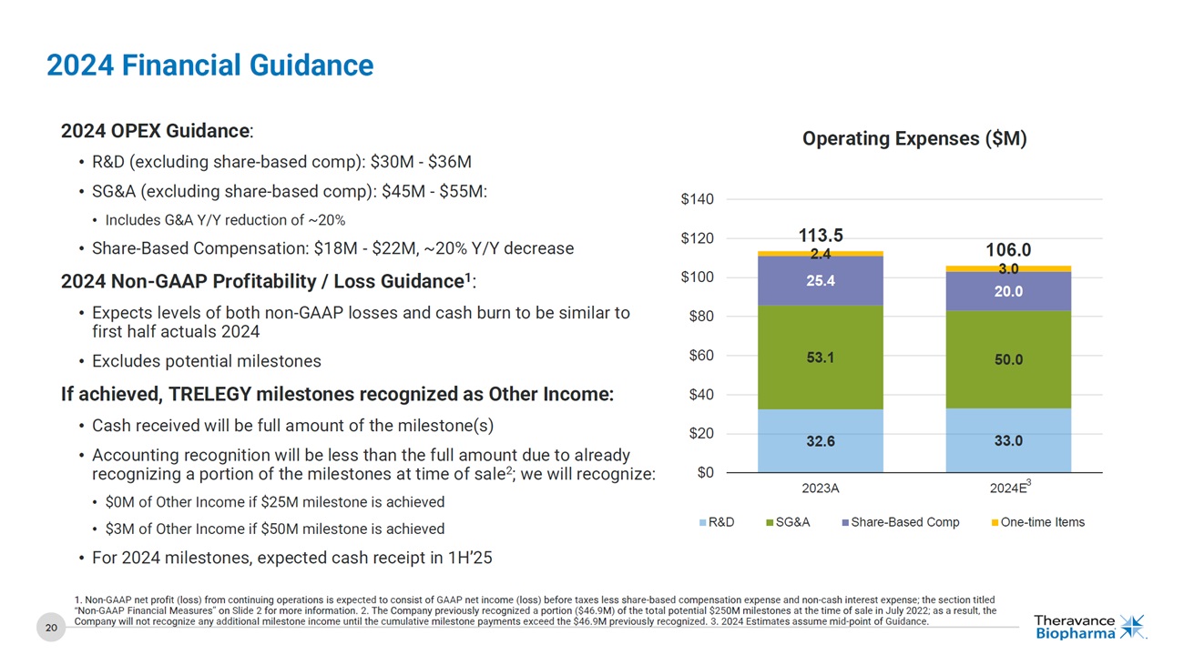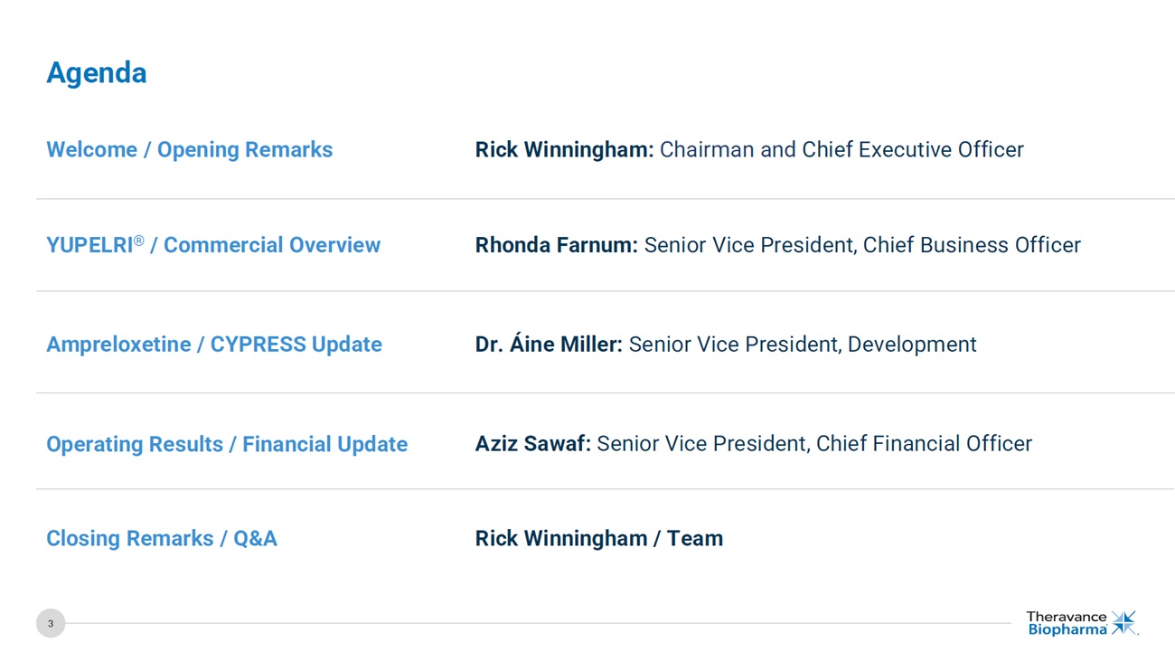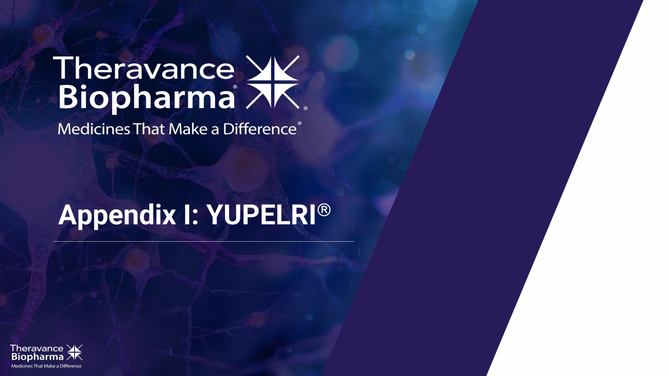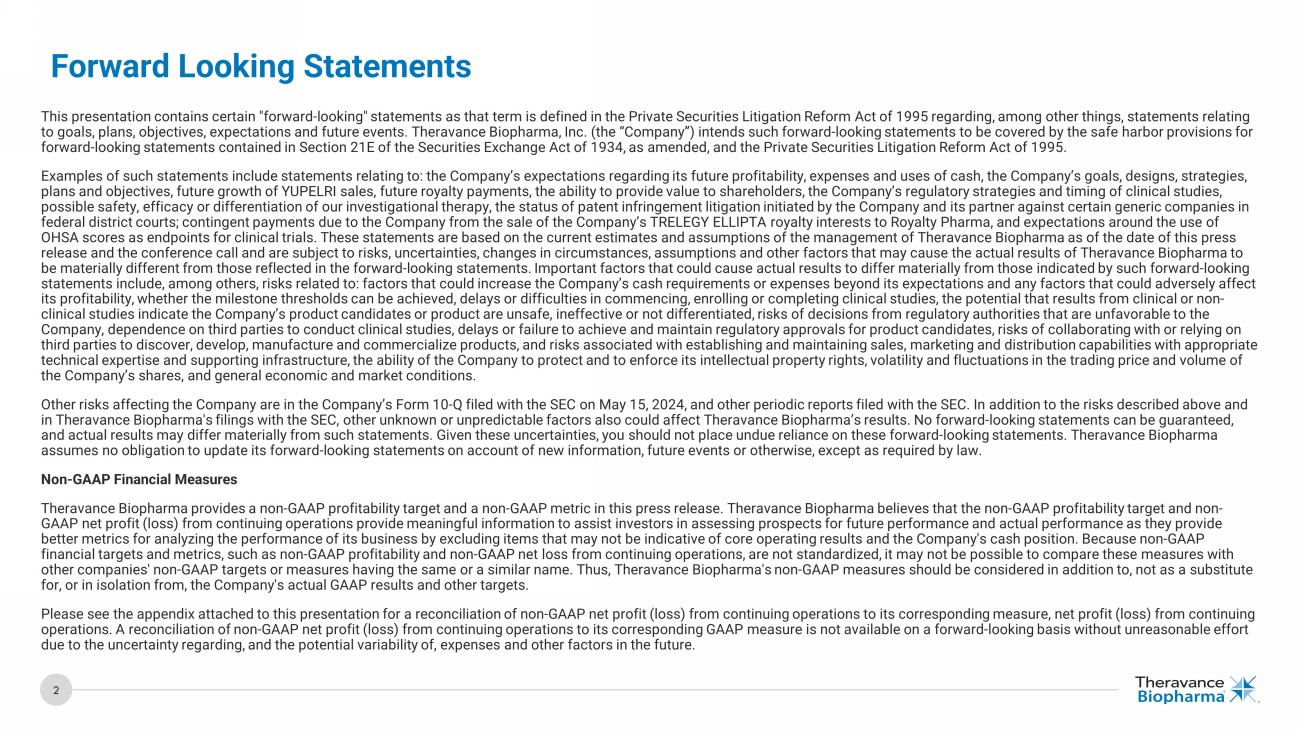 2 Forward Looking Statements This presentation contains certain "forward - looking" statements as that term is defined in the Private Securities Litigation Ref orm Act of 1995 regarding, among other things, statements relating to goals, plans, objectives, expectations and future events. Theravance Biopharma, Inc. (the “Company”) intends such forward - loo king statements to be covered by the safe harbor provisions for forward - looking statements contained in Section 21E of the Securities Exchange Act of 1934, as amended, and the Private Securiti es Litigation Reform Act of 1995. Examples of such statements include statements relating to: the Company’s expectations regarding its future profitability, ex pen ses and uses of cash, the Company’s goals, designs, strategies, plans and objectives, future growth of YUPELRI sales, future royalty payments, the ability to provide value to shareholders, the Company’s regulatory strategies and timing of clinical studies, possible safety, efficacy or differentiation of our investigational therapy, the status of patent infringement litigation ini tia ted by the Company and its partner against certain generic companies in federal district courts; contingent payments due to the Company from the sale of the Company’s TRELEGY ELLIPTA royalty intere sts to Royalty Pharma, and expectations around the use of OHSA scores as endpoints for clinical trials. These statements are based on the current estimates and assumptions of the mana gem ent of Theravance Biopharma as of the date of this press release and the conference call and are subject to risks, uncertainties, changes in circumstances, assumptions and other fact ors that may cause the actual results of Theravance Biopharma to be materially different from those reflected in the forward - looking statements. Important factors that could cause actual result s to differ materially from those indicated by such forward - looking statements include, among others, risks related to: factors that could increase the Company’s cash requirements or expenses b eyo nd its expectations and any factors that could adversely affect its profitability, whether the milestone thresholds can be achieved, delays or difficulties in commencing, enrolling or compl eti ng clinical studies, the potential that results from clinical or non - clinical studies indicate the Company’s product candidates or product are unsafe, ineffective or not differentiated, risks of de cisions from regulatory authorities that are unfavorable to the Company, dependence on third parties to conduct clinical studies, delays or failure to achieve and maintain regulatory approv als for product candidates, risks of collaborating with or relying on third parties to discover, develop, manufacture and commercialize products, and risks associated with establishing and mainta ini ng sales, marketing and distribution capabilities with appropriate technical expertise and supporting infrastructure, the ability of the Company to protect and to enforce its intellectual prop ert y rights, volatility and fluctuations in the trading price and volume of the Company’s shares, and general economic and market conditions. Other risks affecting the Company are in the Company’s Form 10 - Q filed with the SEC on May 15, 2024, and other periodic reports filed with the SEC. In addition to the risks described above and in Theravance Biopharma's filings with the SEC, other unknown or unpredictable factors also could affect Theravance Biopharma ’s results. No forward - looking statements can be guaranteed, and actual results may differ materially from such statements. Given these uncertainties, you should not place undue reliance on these forward - looking statements. Theravance Biopharma assumes no obligation to update its forward - looking statements on account of new information, future events or otherwise, except as required by law. Non - GAAP Financial Measures Theravance Biopharma provides a non - GAAP profitability target and a non - GAAP metric in this press release. Theravance Biopharma believes that the non - GAAP profitability target and non - GAAP net profit (loss) from continuing operations provide meaningful information to assist investors in assessing prospects f or future performance and actual performance as they provide better metrics for analyzing the performance of its business by excluding items that may not be indicative of core operating res ults and the Company's cash position. Because non - GAAP financial targets and metrics, such as non - GAAP profitability and non - GAAP net loss from continuing operations, are not standard ized, it may not be possible to compare these measures with other companies' non - GAAP targets or measures having the same or a similar name. Thus, Theravance Biopharma's non - GAAP measures should be considered in addition to, not as a substitute for, or in isolation from, the Company's actual GAAP results and other targets. Please see the appendix attached to this presentation for a reconciliation of non - GAAP net profit (loss) from continuing operati ons to its corresponding measure, net profit (loss) from continuing operations. A reconciliation of non - GAAP net profit (loss) from continuing operations to its corresponding GAAP measure is not a vailable on a forward - looking basis without unreasonable effort due to the uncertainty regarding, and the potential variability of, expenses and other factors in the future.