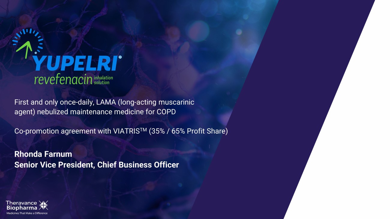 First and only once - daily, LAMA (long - acting muscarinic agent) nebulized maintenance medicine for COPD Co - promotion agreement with VIATRIS TM (35% / 65% Profit Share) Rhonda Farnum Senior Vice President, Chief Business Officer