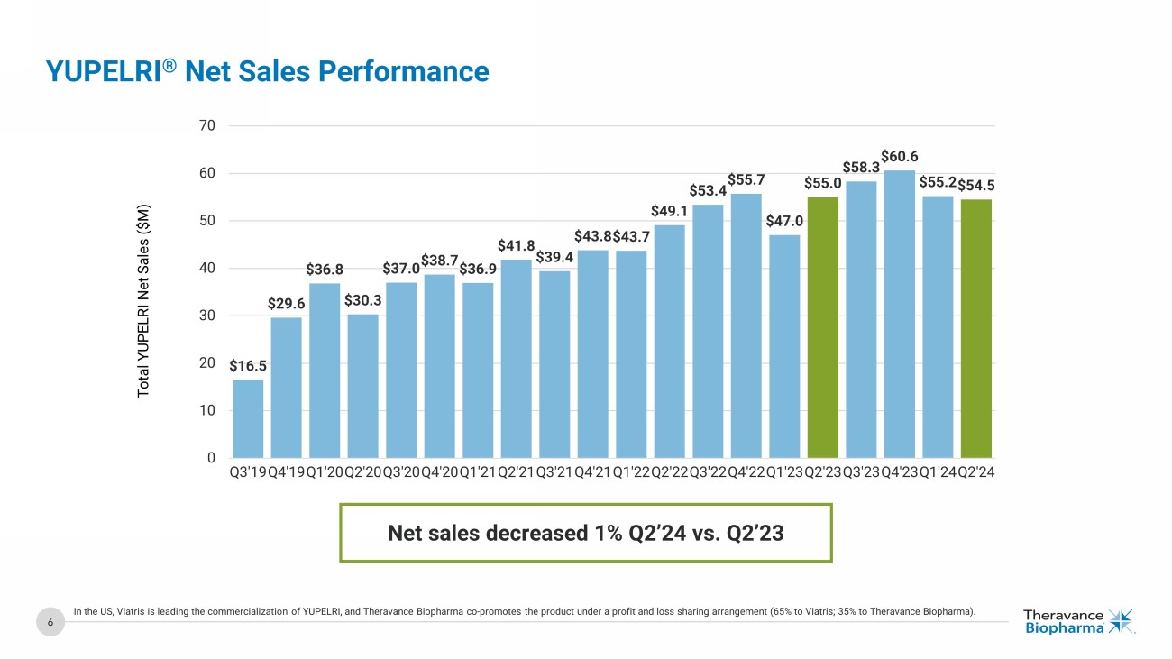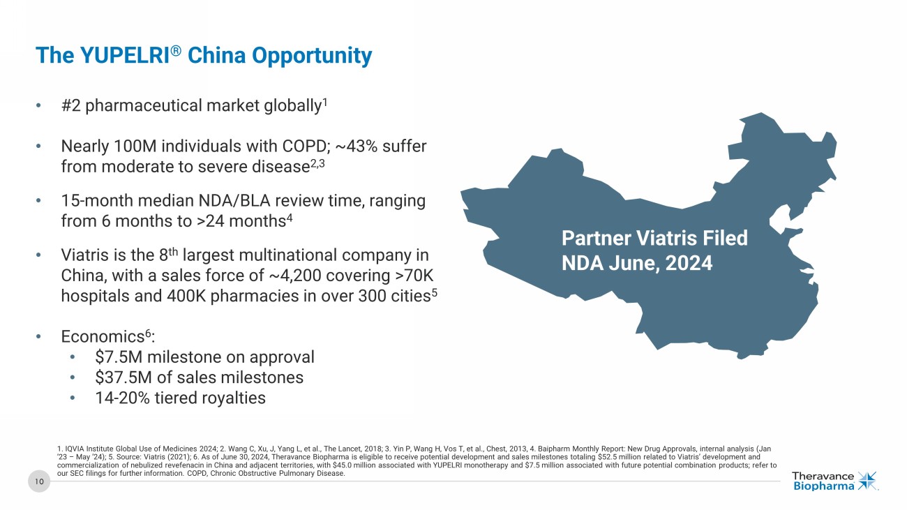 11 YUPELRI ® Value Proposition 1. In the US, Viatris is leading the commercialization of YUPELRI, and Theravance Biopharma co - promotes the product under a profit and loss sharing a rrangement (65% to Viatris ; 35% to Theravance Biopharma). 2. As of June 30, 2024, Theravance Biopharma is eligible to receive from Viatris potential global development, regulatory and sales milestone payments (excluding China and adjacent territories) totaling up to $205.0 million in the aggregate; refer to our SEC filings for further information. 3. As of June 30, 2024, Theravance Biopharma is e lig ible to receive potential development and sales milestones totaling $52.5 million related to Viatris ’ development and commercialization of nebulized revefenacin in China and adjacent territories, with $45.0 million associated wi th YUPELRI monotherapy and $7.5 million associated with future potential combination products; refer to our SEC filings for further information . 4. Refer to our SEC filings for further information. COPD, chronic obstructive pulmonary disease; LAMA, long - acting muscarinic agent . 11 • Only Once - Daily Nebulized LAMA COPD Maintenance Treatment • Significant Commercial Opportunity Going Forward: • U.S. YUPELRI Co - Promote 1 : Last Twelve Months’ sales of $229M as of 6/30/24 • Brand profitable, with expanding profit margins • Significant potential milestones and royalties: • U.S. Monotherapy: Up to $150M in sales milestones 2 ; first $25M for $250M of net sales in any calendar year • China Monotherapy: Up to $45M in development and sales milestones; 14 - 20% tiered royalties 3 • OUS (ex - China): Low double - digit to mid - teens royalties 4 • IP protection granted to 2039 in the US , with an additional 2039 patent granted July 2024