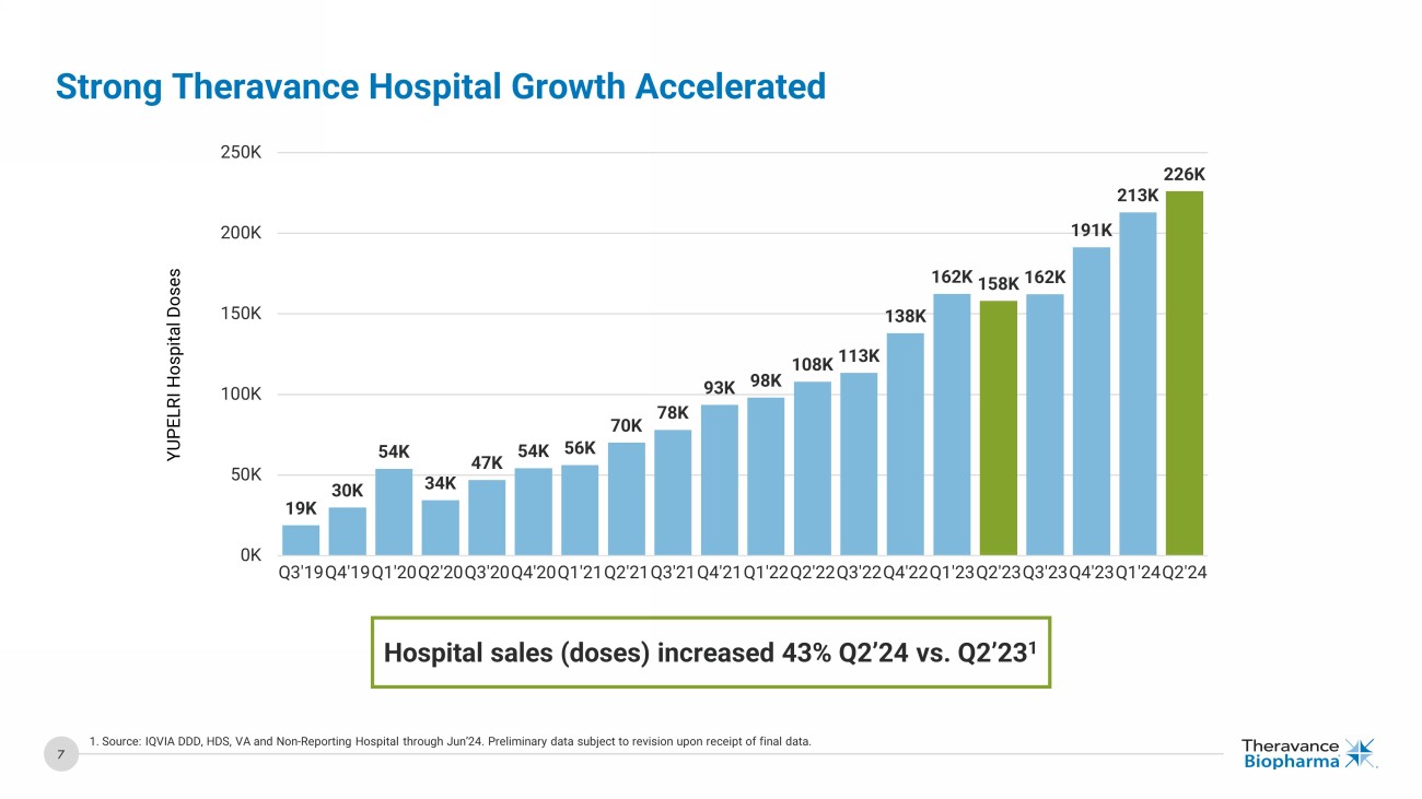 6 YUPELRI ® Net Sales Performance In the US, Viatris is leading the commercialization of YUPELRI, and Theravance Biopharma co - promotes the product under a profit and loss sharing a rrangement (65% to Viatris ; 35% to Theravance Biopharma). 6 $16.5 $29.6 $36.8 $30.3 $37.0 $38.7 $36.9 $41.8 $39.4 $43.8 $43.7 $49.1 $53.4 $55.7 $47.0 $55.0 $58.3 $60.6 $55.2 $54.5 0 10 20 30 40 50 60 70 Q3'19 Q4'19 Q1'20 Q2'20 Q3'20 Q4'20 Q1'21 Q2'21 Q3'21 Q4'21 Q1'22 Q2'22 Q3'22 Q4'22 Q1'23 Q2'23 Q3'23 Q4'23 Q1'24 Q2'24 Total YUPELRI Net Sales ($M) Net sales decreased 1% Q2’24 vs. Q2’23