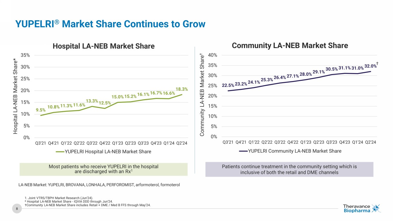 7 Strong Theravance Hospital Growth Accelerated 1. Source: IQVIA DDD, HDS, VA and Non - Reporting Hospital through Jun’24. Preliminary data subject to revision upon receipt of fi nal data. 7 19K 30K 54K 34K 47K 54K 56K 70K 78K 93K 98K 108K 113K 138K 162K 158K 162K 191K 213K 226K 0K 50K 100K 150K 200K 250K Q3'19 Q4'19 Q1'20 Q2'20 Q3'20 Q4'20 Q1'21 Q2'21 Q3'21 Q4'21 Q1'22 Q2'22 Q3'22 Q4'22 Q1'23 Q2'23 Q3'23 Q4'23 Q1'24 Q2'24 YUPELRI Hospital Doses Hospital sales (doses) increased 43% Q2’24 vs. Q2’23 1