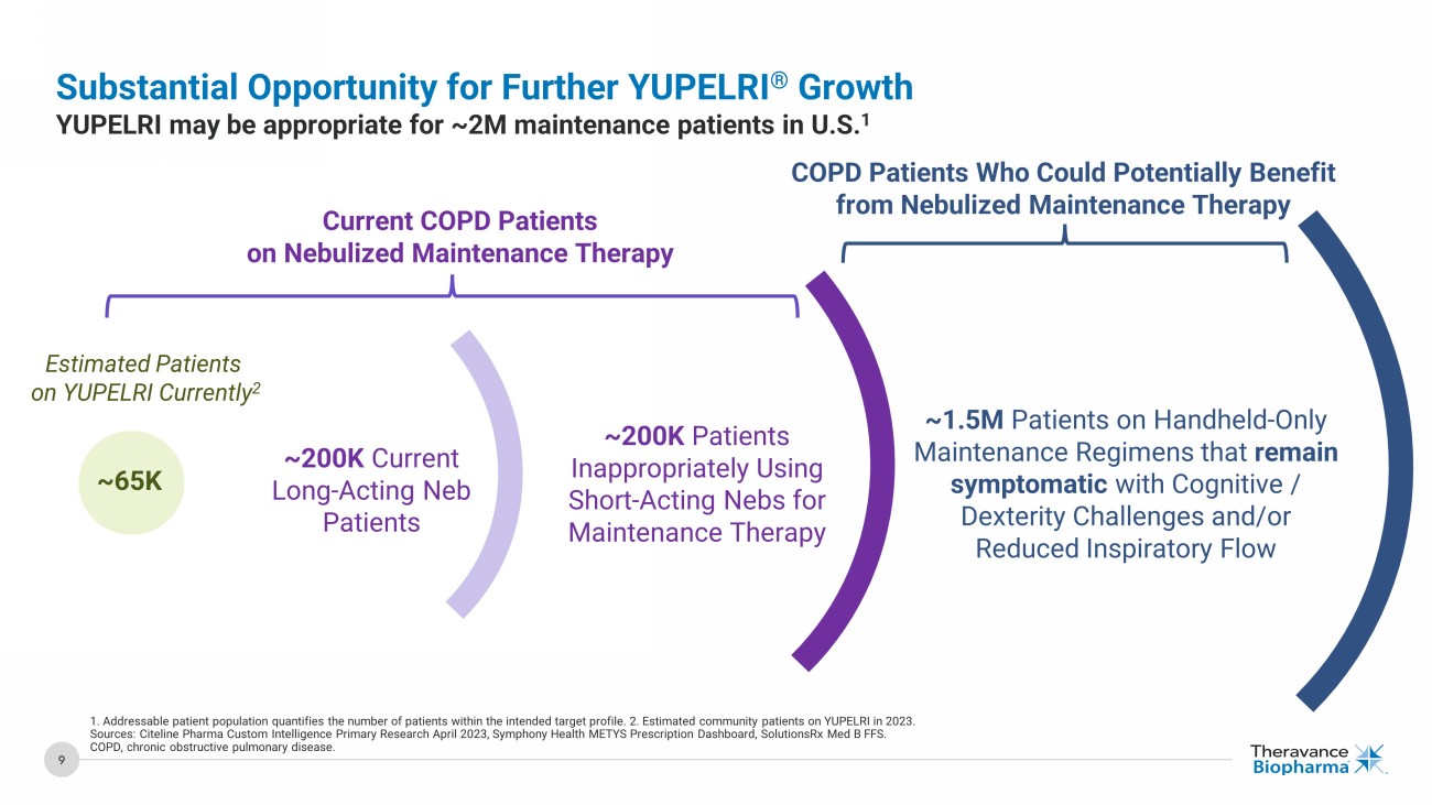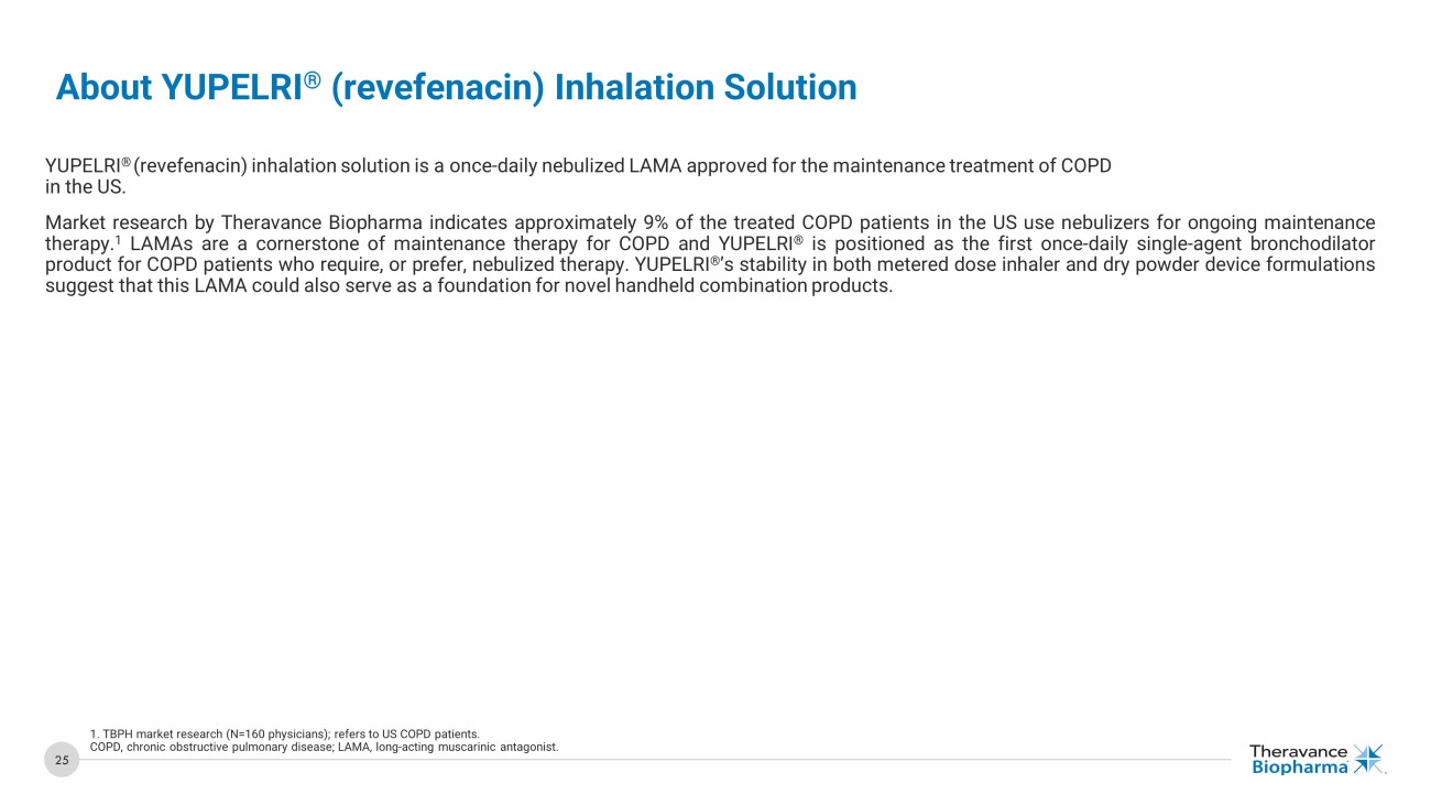 25 About YUPELRI ® ( revefenacin ) Inhalation Solution YUPELRI ® ( revefenacin ) inhalation solution is a once - daily nebulized LAMA approved for the maintenance treatment of COPD in the US . Market research by Theravance Biopharma indicates approximately 9 % of the treated COPD patients in the US use nebulizers for ongoing maintenance therapy . 1 LAMAs are a cornerstone of maintenance therapy for COPD and YUPELRI ® is positioned as the first once - daily single - agent bronchodilator product for COPD patients who require, or prefer, nebulized therapy . YUPELRI ® ’s stability in both metered dose inhaler and dry powder device formulations suggest that this LAMA could also serve as a foundation for novel handheld combination products . 1. TBPH market research (N=160 physicians); refers to US COPD patients. COPD, chronic obstructive pulmonary disease; LAMA, long - acting muscarinic antagonist. 25