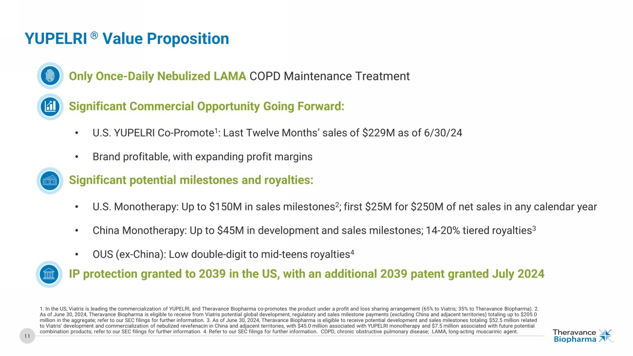 10 The YUPELRI ® China Opportunity 1. IQVIA Institute Global Use of Medicines 2024; 2. Wang C, Xu, J, Yang L, et al., The Lancet, 2018; 3. Yin P, Wang H, Vos T, et al., Chest, 2013, 4. Baipharm Monthly Report: New Drug Approvals, internal analysis (Jan ’23 – May ’24); 5. Source: Viatris (2021); 6. As of June 30, 2024, Theravance Biopharma is eligible to receive potential development and sales milestones totali ng $52.5 million related to Viatris ’ development and commercialization of nebulized revefenacin in China and adjacent territories, with $45.0 million associated with YUPELRI mono the rapy and $7.5 million associated with future potential combination products; refer to our SEC filings for further information. COPD, Chronic Obstructive Pulmonary Disease. • #2 pharmaceutical market g lobally 1 • Nearly 100M individuals with COPD; ~43% suffer from moderate to severe disease 2,3 • 15 - month median NDA/BLA review time, ranging from 6 months to >24 months 4 • Viatris is the 8 th largest multinational company in China, with a sales force of ~4,200 covering >70K hospitals and 400K pharmacies in over 300 cities 5 • Economics 6 : • $7.5M milestone on approval • $37.5M of sales milestones • 14 - 20% tiered royalties Partner Viatris Filed NDA June, 2024