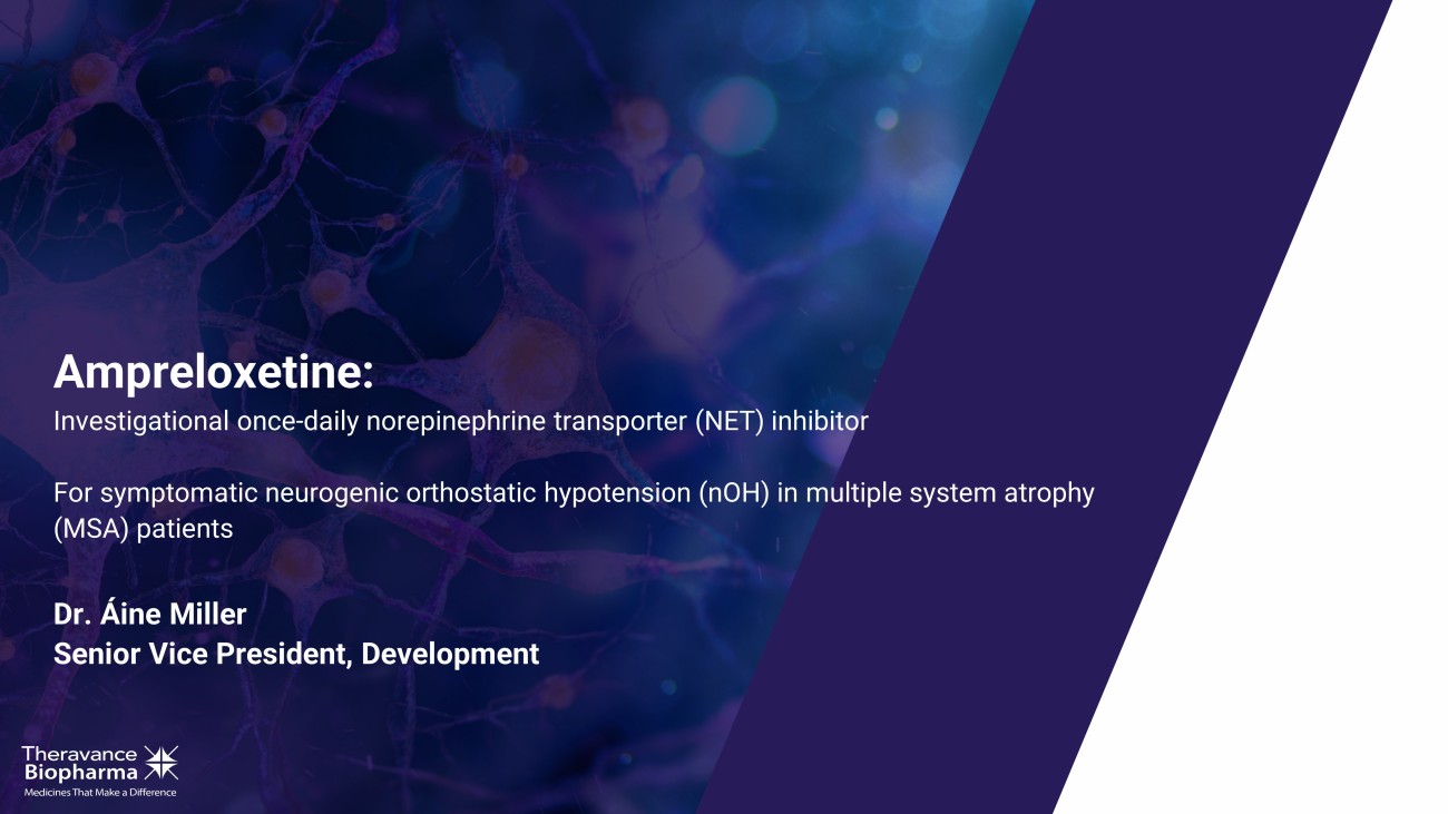 Ampreloxetine: Investigational once - daily norepinephrine transporter (NET) inhibitor For symptomatic neurogenic orthostatic hypotension ( nOH ) in multiple system atrophy (MSA) patients Dr. Áine Miller Senior Vice President, Development