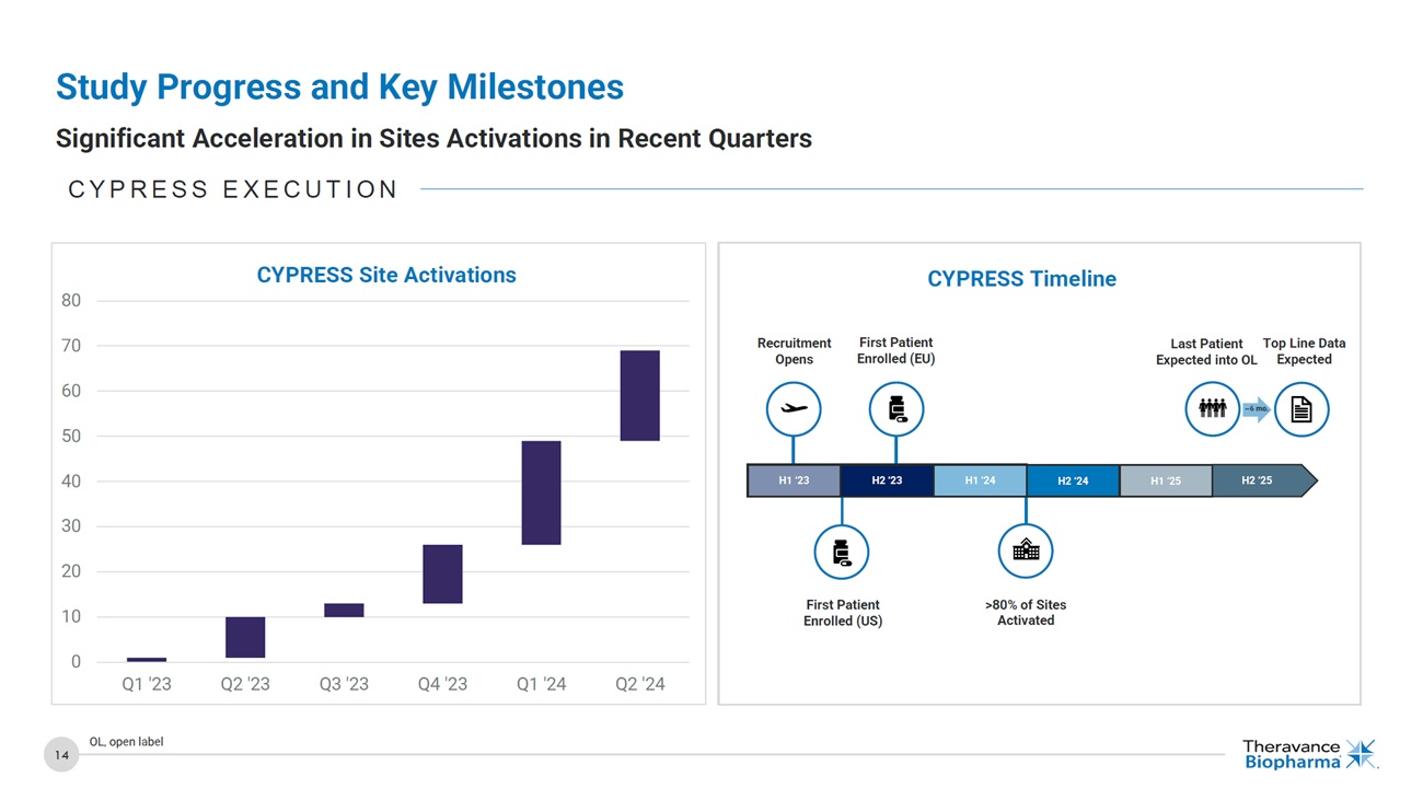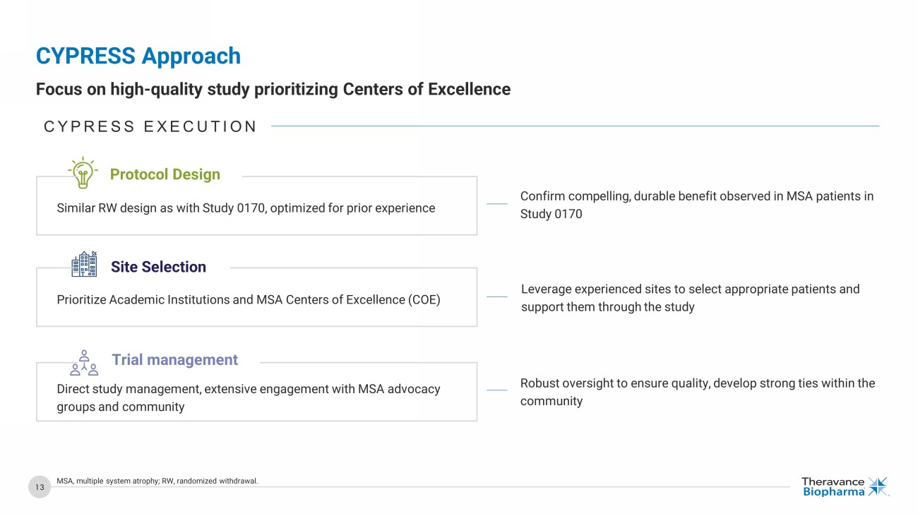 13 CYPRESS Approach Focus on high - quality study prioritizing Centers of Excellence CYPRESS EXECUTION MSA, multiple system atrophy; RW, randomized withdrawal. Prioritize Academic Institutions and MSA Centers of Excellence (COE) Site Selection Leverage experienced sites to select appropriate patients and support them through the study Robust oversight to ensure quality, develop strong ties within the community Direct study management , e xtensive engagement with MSA advocacy groups and community Trial management Similar RW design as with Study 0170, optimized for prior experience Protocol Design Confirm compelling, durable benefit observed in MSA patients in Study 0170