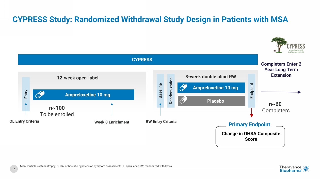 14 Study Progress and Key Milestones Significant Acceleration in Sites Activations in Recent Quarters CYPRESS EXECUTION OL, open label 0 10 20 30 40 50 60 70 80 Q1 '23 Q2 '23 Q3 '23 Q4 '23 Q1 '24 Q2 '24 CYPRESS Site Activations First Patient Enrolled (US) Recruitment Opens >80% of Sites Activated Top Line Data Expected Last Patient Expected into OL First Patient Enrolled (EU) CYPRESS Timeline ~6 mo. H1 ‘24 H1 ‘23 H2 ‘23 H2 ‘24 H1 ‘25 H2 ‘25
