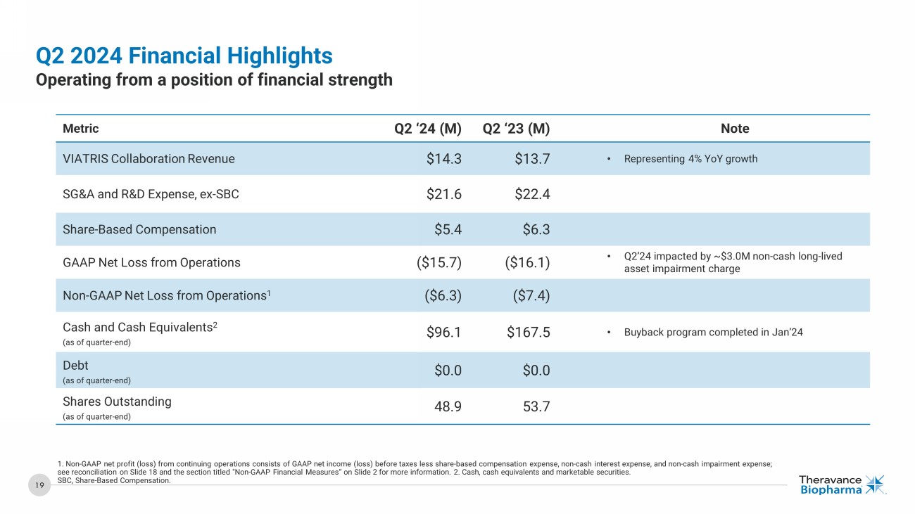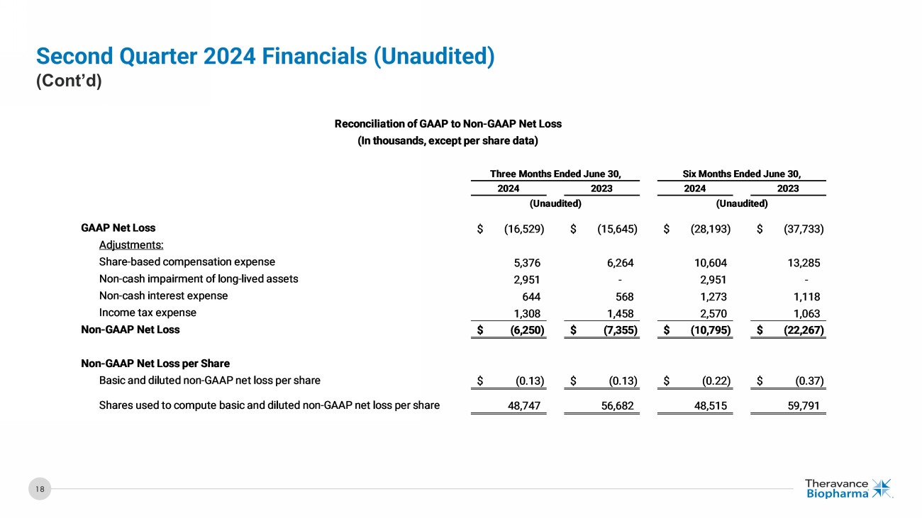 17 Second Quarter 2024 Financials (Unaudited) 1. Amounts include share - based compensation. 2. Non - GAAP net profit (loss) from continuing operations consists of GAAP net loss before taxes excluding share - based compensation expense, non - cash interest expense and non - cash impairment expense; see reconciliation on Slide 18 and the section titled "Non - GAAP Financial Measures“ on Slide 2 for more information. 17 ($, in thousands) Revenue: Viatris collaboration agreement $ 14,256 $ 13,743 $ 28,759 $ 24,154 Collaboration revenue - 6 - 12 Total revenue 14,256 13,749 28,759 24,166 Costs and expenses: Research and development (1) 9,954 9,425 18,922 23,997 Selling, general and administrative (1) 17,056 19,278 33,798 38,461 Impairment of long-lived assets (non-cash) 2,951 - 2,951 - Restructuring and related expenses (1) - 1,169 - 2,743 Total costs and expenses 29,961 29,872 55,671 65,201 Loss from operations (before tax and other income & expense) $ (15,705) $ (16,123) $ (26,912) $ (41,035) Share-based compensation expense: Research and development 1,151 1,855 2,616 4,296 Selling, general and administrative 4,225 4,409 7,988 8,632 Restructuring and related expenses - - - 357 Total share-based compensation expense 5,376 6,264 10,604 13,285 Operating expense excl. share-based compensation: R&D operating expense (excl. share-based compensation) 8,803 7,570 16,306 19,701 SG&A operating expense (excl. share-based compensation) 12,831 14,869 25,810 29,829 Total operating expenses excl. share-based compensation $ 21,634 $ 22,439 $ 42,116 $ 49,530 Non-GAAP net loss (2) $ (6,250) $ (7,355) $ (10,795) $ (22,267) Three Months Ended June 30, 2024 2023 (Unaudited) Six Months Ended June 30, 2024 2023 (Unaudited)