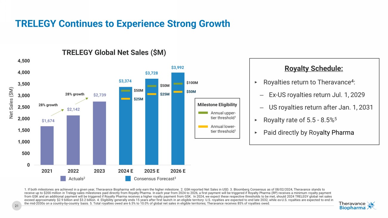 20 2024 Financial Guidance 1. Non - GAAP net profit (loss) from continuing operations is expected to consist of GAAP net income (loss) before taxes less shar e - based compensation expense and non - cash interest expense; the section titled “Non - GAAP Financial Measures” on Slide 2 for more information. 2. The Company previously recognized a portion ($46.9M) of the to tal potential $250M milestones at the time of sale in July 2022; as a result, the Company will not recognize any additional milestone income until the cumulative milestone payments exceed the $46.9M previous ly recognized. 3. 2024 Estimates assume mid - point of Guidance. 20 32.6 33.0 53.1 50.0 25.4 20.0 2.4 3.0 113.5 106.0 $0 $20 $40 $60 $80 $100 $120 $140 2023A 2024E R&D SG&A Share-Based Comp One-time Items Operating Expenses ($M) 2024 OPEX Guidance : • R&D (excluding share - based comp): $30M - $36M • SG&A (excluding share - based comp): $45M - $55M: • Includes G&A Y/Y reduction of ~20% • Share - Based Compensation: $18M - $22M, ~20% Y/Y decrease 2024 Non - GAAP Profitability / Loss Guidance 1 : • Expects levels of both non - GAAP losses and cash burn to be similar to first half actuals 2024 • Excludes potential milestones If achieved, TRELEGY milestones recognized as Other Income: • Cash received will be full amount of the milestone(s) • Accounting recognition will be less than the full amount due to already recognizing a portion of the milestones at time of sale 2 ; we will recognize: • $0M of Other Income if $25M milestone is achieved • $3M of Other Income if $50M milestone is achieved • For 2024 milestones, expected cash receipt in 1H’25 3