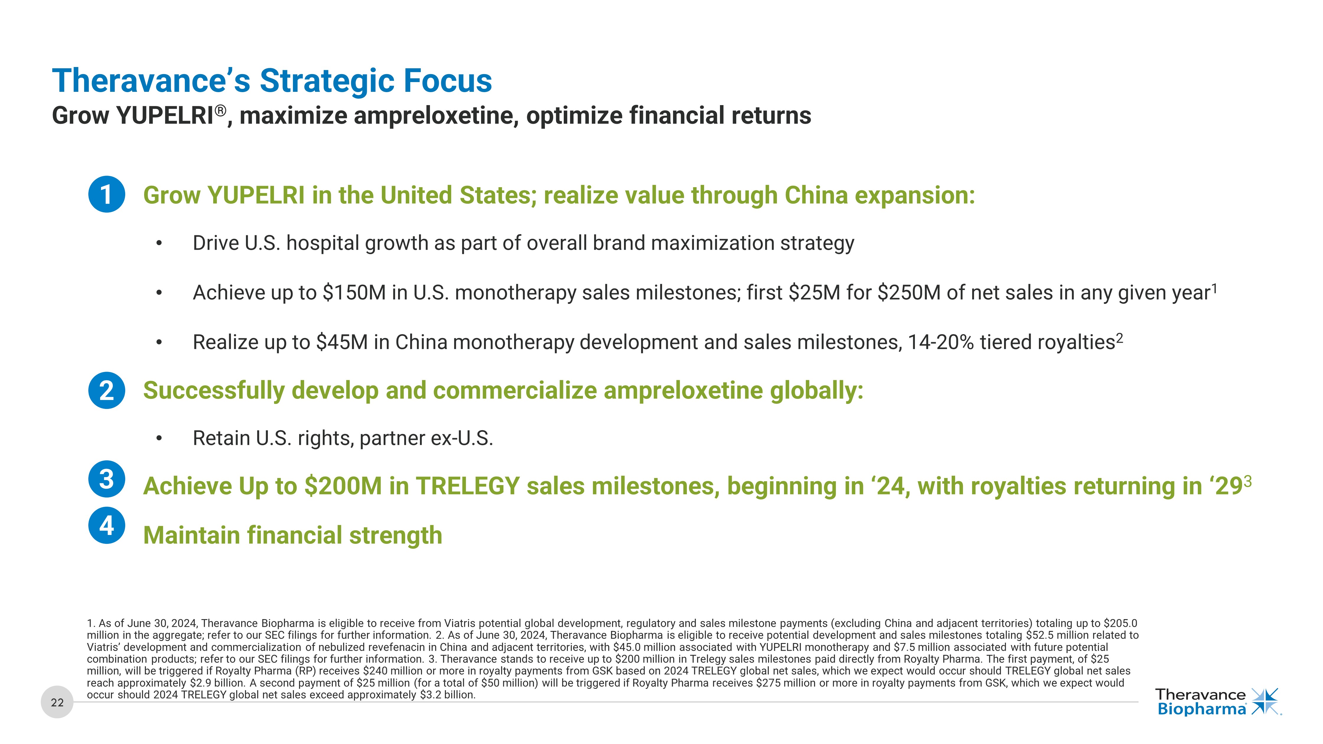 21 21 0 500 1,000 1,500 2,000 2,500 3,000 3,500 4,000 4,500 2021 2022 2023 2024 E 2025 E 2026 E Consensus Forecast 3 Actuals 2 Net Sales ($M) Annual upper - tier threshold 1 Annual lower - tier threshold 1 TRELEGY Global Net Sales ($M) $50M $25M $50M $25M $100M $50M $1,674 $2,142 $2,739 $3,3 74 $3,7 28 $3,992 28% growth 28% growth 1. If both milestones are achieved in a given year, Theravance Biopharma will only earn the higher milestone. 2. GSK - reported Ne t Sales in USD. 3. Bloomberg Consensus as of 08/02/2024, Theravance stands to receive up to $200 million in Trelegy sales milestones paid directly from Royalty Pharma. In each year from 2024 to 2026, a first payment will be triggered if Roya lt y Pharma (RP) receives a minimum royalty payment from GSK and an additional payment will be triggered if Royalty Pharma receives a higher royalty payment from GSK. In 2024, we expect these respective thresholds to be met, should 2024 TRELEGY global net sales exceed approximately $2.9 billion and $3.2 billion. 4. Eligibility generally ends 15 years after first launch in an eligible ter ritory: U.S. royalties are expected to end late 2032, while ex - U.S. royalties are expected to end in the mid - 2030s on a country - by - country basis. 5. Total royalties owed are 6.5% to 10.0% of global net sales in eligible territori es; Theravance receives 85% of royalties owed. Royalty Schedule: ‣ Royalties return to Theravance 4 : – Ex - US royalties return Jul. 1, ௗ 2029 – US royalties return after Jan. 1, ௗ 2031 ‣ Royalty rate of 5.5 - 8.5% 5 ‣ Paid directly by Roy alty Pharma Milestone Eligibility TRELEGY Continues to Experience Strong Growth