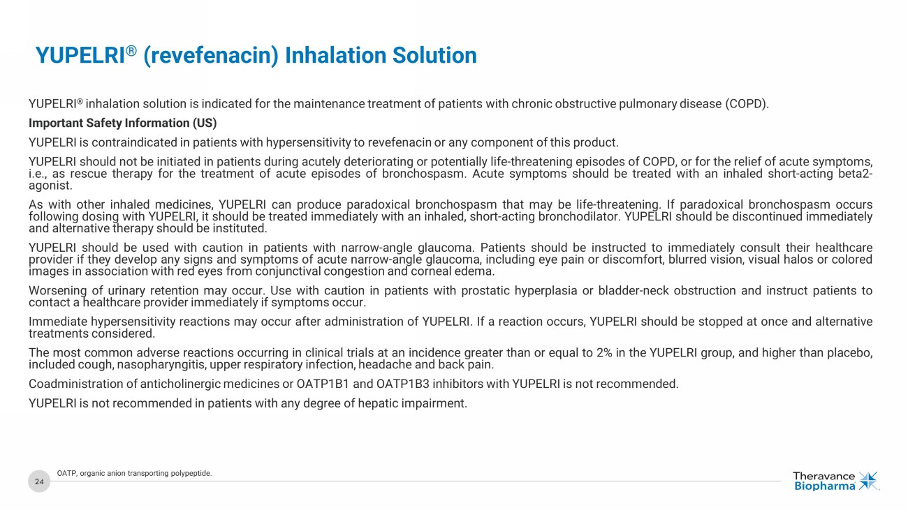 24 YUPELRI ® (revefenacin) Inhalation Solution YUPELRI ® inhalation solution is indicated for the maintenance treatment of patients with chronic obstructive pulmonary disease (COPD) . Important Safety Information (US) YUPELRI is contraindicated in patients with hypersensitivity to revefenacin or any component of this product . YUPELRI should not be initiated in patients during acutely deteriorating or potentially life - threatening episodes of COPD, or for the relief of acute symptoms, i . e . , as rescue therapy for the treatment of acute episodes of bronchospasm . Acute symptoms should be treated with an inhaled short - acting beta 2 - agonist . As with other inhaled medicines, YUPELRI can produce paradoxical bronchospasm that may be life - threatening . If paradoxical bronchospasm occurs following dosing with YUPELRI, it should be treated immediately with an inhaled, short - acting bronchodilator . YUPELRI should be discontinued immediately and alternative therapy should be instituted . YUPELRI should be used with caution in patients with narrow - angle glaucoma . Patients should be instructed to immediately consult their healthcare provider if they develop any signs and symptoms of acute narrow - angle glaucoma, including eye pain or discomfort, blurred vision, visual halos or colored images in association with red eyes from conjunctival congestion and corneal edema . Worsening of urinary retention may occur . Use with caution in patients with prostatic hyperplasia or bladder - neck obstruction and instruct patients to contact a healthcare provider immediately if symptoms occur . Immediate hypersensitivity reactions may occur after administration of YUPELRI . If a reaction occurs, YUPELRI should be stopped at once and alternative treatments considered . The most common adverse reactions occurring in clinical trials at an incidence greater than or equal to 2 % in the YUPELRI group, and higher than placebo, included cough, nasopharyngitis, upper respiratory infection, headache and back pain . Coadministration of anticholinergic medicines or OATP 1 B 1 and OATP 1 B 3 inhibitors with YUPELRI is not recommended . YUPELRI is not recommended in patients with any degree of hepatic impairment . OATP, organic anion transporting polypeptide. 24