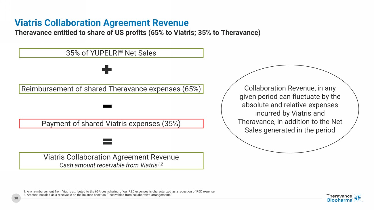28 Viatris Collaboration Agreement Revenue Theravance entitled to share of US profits (65% to Viatris; 35% to Theravance) 1. Any reimbursement from Viatris attributed to the 65% cost - sharing of our R&D expenses is characterized as a reduction of R&D expense. 2. Amount included as a receivable on the balance sheet as “Receivables from collaborative arrangements.” 28 Viatris Collaboration Agreement Revenue Cash amount receivable from Viatris 1,2 Payment of shared Viatris expenses (35%) Reimbursement of shared Theravance expenses (65%) 35% of YUPELRI ® Net Sales Collaboration Revenue, in any given period can fluctuate by the absolute and relative expenses incurred by Viatris and Theravance, in addition to the Net Sales generated in the period