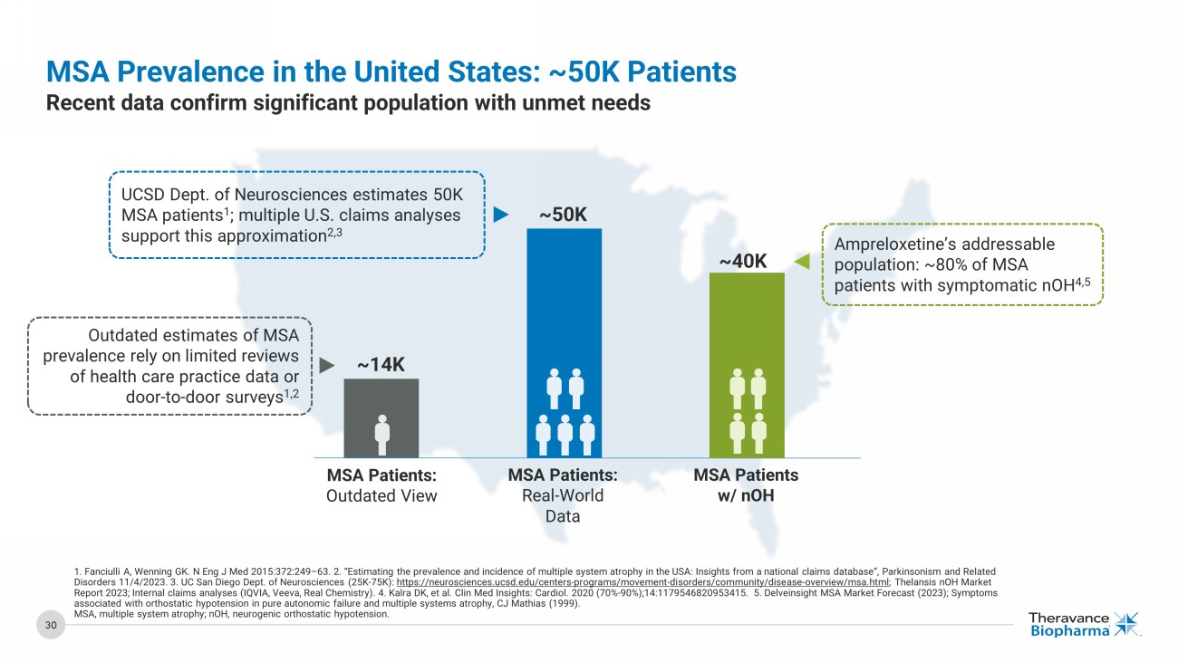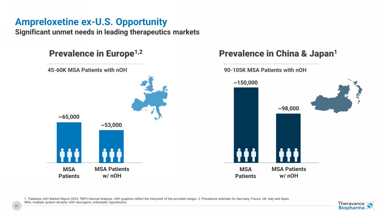 30 MSA Prevalence in the United States: ~50K Patients Recent data confirm significant population with unmet needs 1. Fanciulli A, Wenning GK. N Eng J Med 2015:372:249 – 63. 2. “Estimating the prevalence and incidence of multiple system atrophy in the USA: Insights from a national claims database”, Parkinsonism and Related Disorders 11/4/2023. 3. UC San Diego Dept. of Neurosciences (25K - 75K): https://neurosciences.ucsd.edu/centers - programs/movement - disorders/community/disease - overview/msa.html ; Thelansis nOH Market Report 2023 ; Internal claims analyses (IQVIA, Veeva, Real Chemistry). 4. Kalra DK, et al. Clin Med Insights: Cardiol. 2020 (70% - 90%);14:1179546820953415. 5. Delveinsight MSA Market Forecast (2023); Sy mptoms associated with orthostatic hypotension in pure autonomic failure and multiple systems atrophy, CJ Mathias (1999). MSA, multiple system atrophy; nOH, neurogenic orthostatic hypotension. 30 ~14K MSA Patients: Outdated View MSA Patients: Real - World Data ~50K Outdated estimates of MSA prevalence rely on limited reviews of health care practice data or door - to - door surveys 1,2 UCSD Dept. of Neurosciences estimates 50K MSA patients 1 ; multiple U.S. claims analyses support this approximation 2,3 MSA Patients w/ nOH ~40K Ampreloxetine’s addressable population: ~80% of MSA patients with symptomatic nOH 4,5