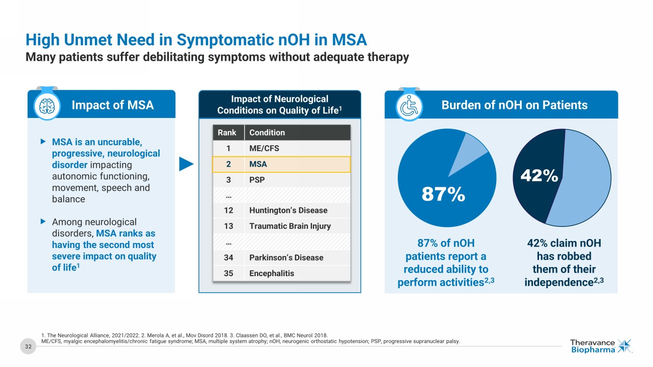 31 Ampreloxetine ex - U.S. Opportunity Significant unmet needs in leading therapeutics markets 1. Thelansis nOH Market Report 2023; TBPH Internal Analysis. nOH graphics reflect the mid - point of the provided ranges. 2. Prevalen ce estimate for Germany, France, UK, Italy and Spain. MSA, multiple system atrophy; nOH neurogenic orthostatic hypotension. 31 Prevalence in Europe 1,2 ~65,000 ~53,000 MSA Patients MSA Patients w/ nOH 45 - 60K MSA Patients with nOH Prevalence in China & Japan 1 ~150,000 ~98,000 MSA Patients MSA Patients w/ nOH 90 - 105K MSA Patients with nOH