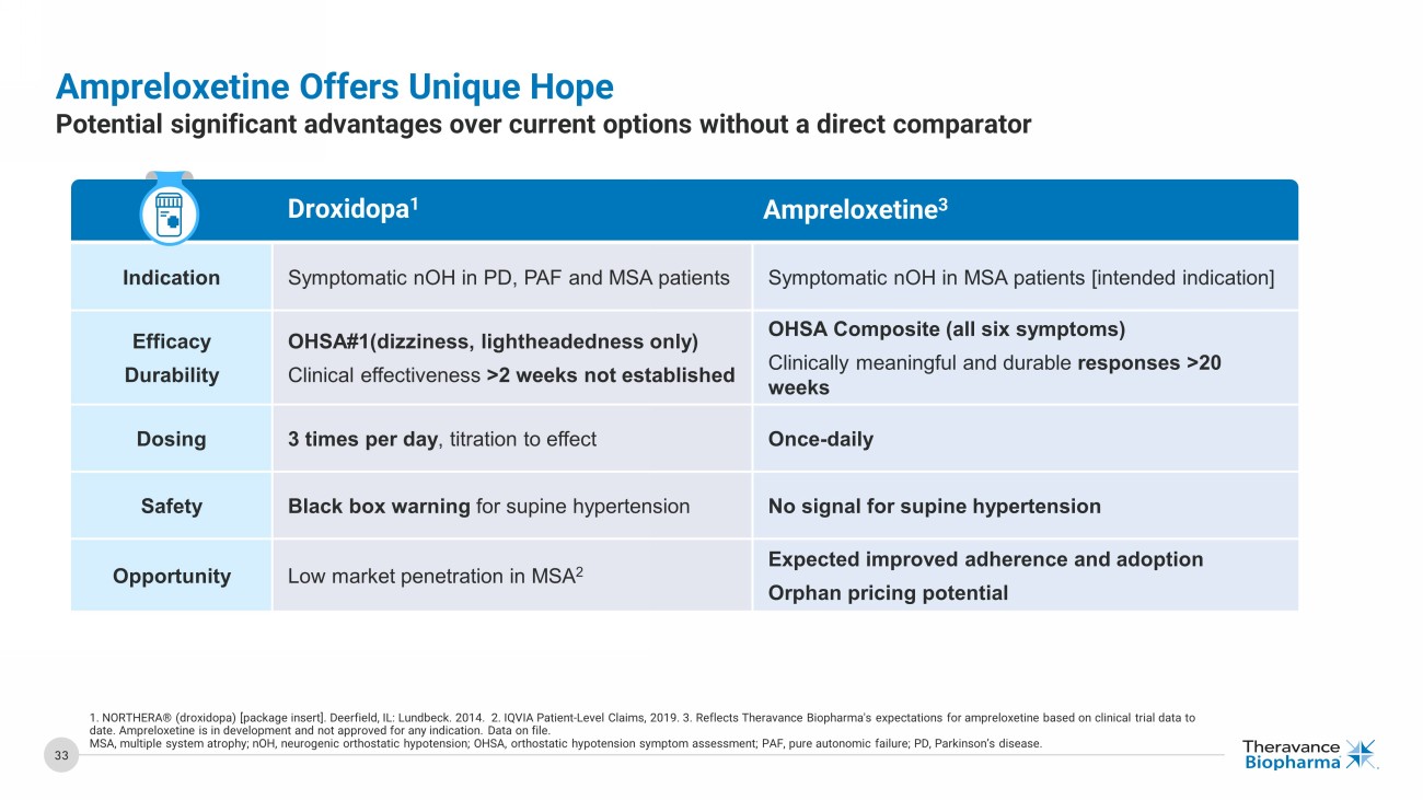32 High Unmet Need in Symptomatic nOH in MSA Many patients suffer debilitating symptoms without adequate therapy 1 . The Neurological Alliance, 2021/2022. 2 . Merola A, et al., Mov Disord 2018 . 3. Claassen DO, et al., BMC Neurol 2018. ME/CFS, myalgic encephalomyelitis/chronic fatigue syndrome; MSA, multiple system atrophy; nOH , neurogenic orthostatic hypotension; PSP, progressive supranuclear palsy. Impact of MSA ‣ MSA is an uncurable, progressive, neurological disorder impacting autonomic functioning, movement, speech and balance ‣ Among neurological disorders, MSA ranks as having the second most severe impact on quality of life 1 Impact of Neurological Conditions on Quality of Life 1 Rank Condition 1 ME/CFS 2 MSA 3 PSP … 12 Huntington’s Disease 13 Traumatic Brain Injury … 34 Parkinson’s Disease 35 Encephalitis Burden of nOH on Patients 87% 42% 87% of nOH patients report a reduced ability to perform activities 2,3 42% claim nOH has robbed them of their independence 2,3