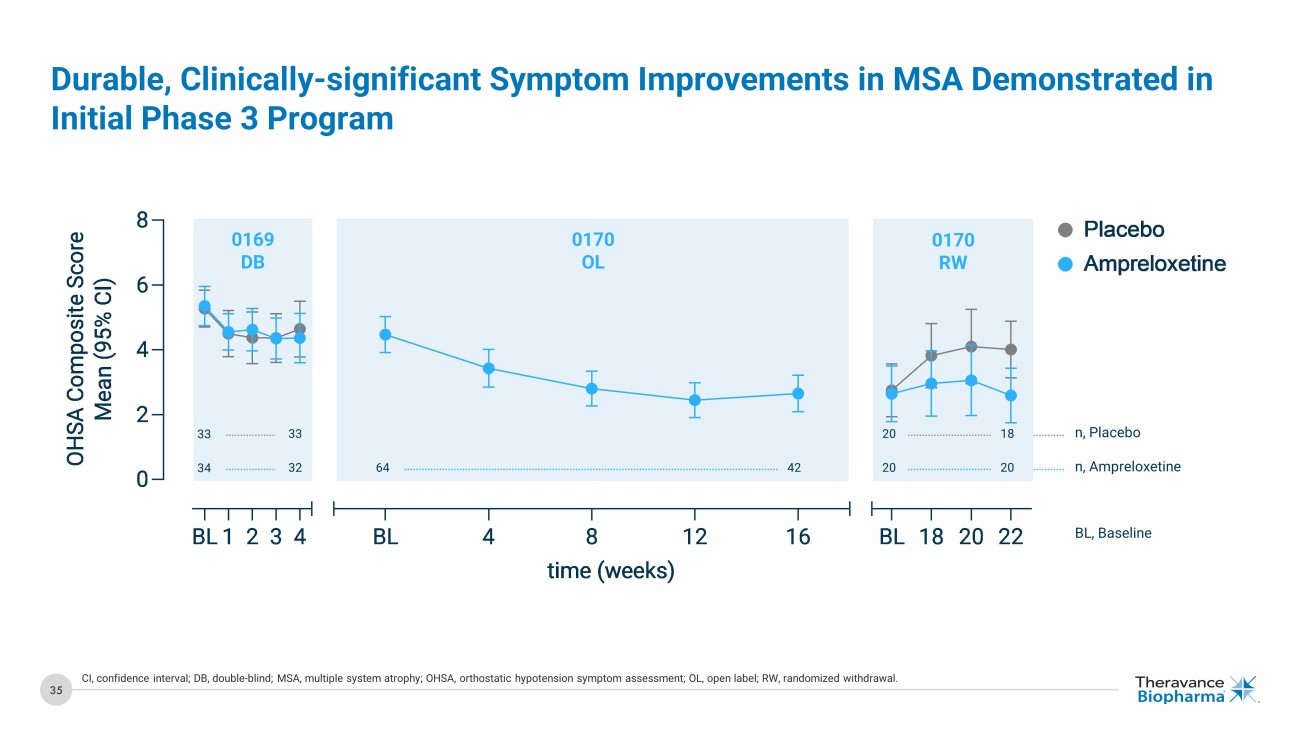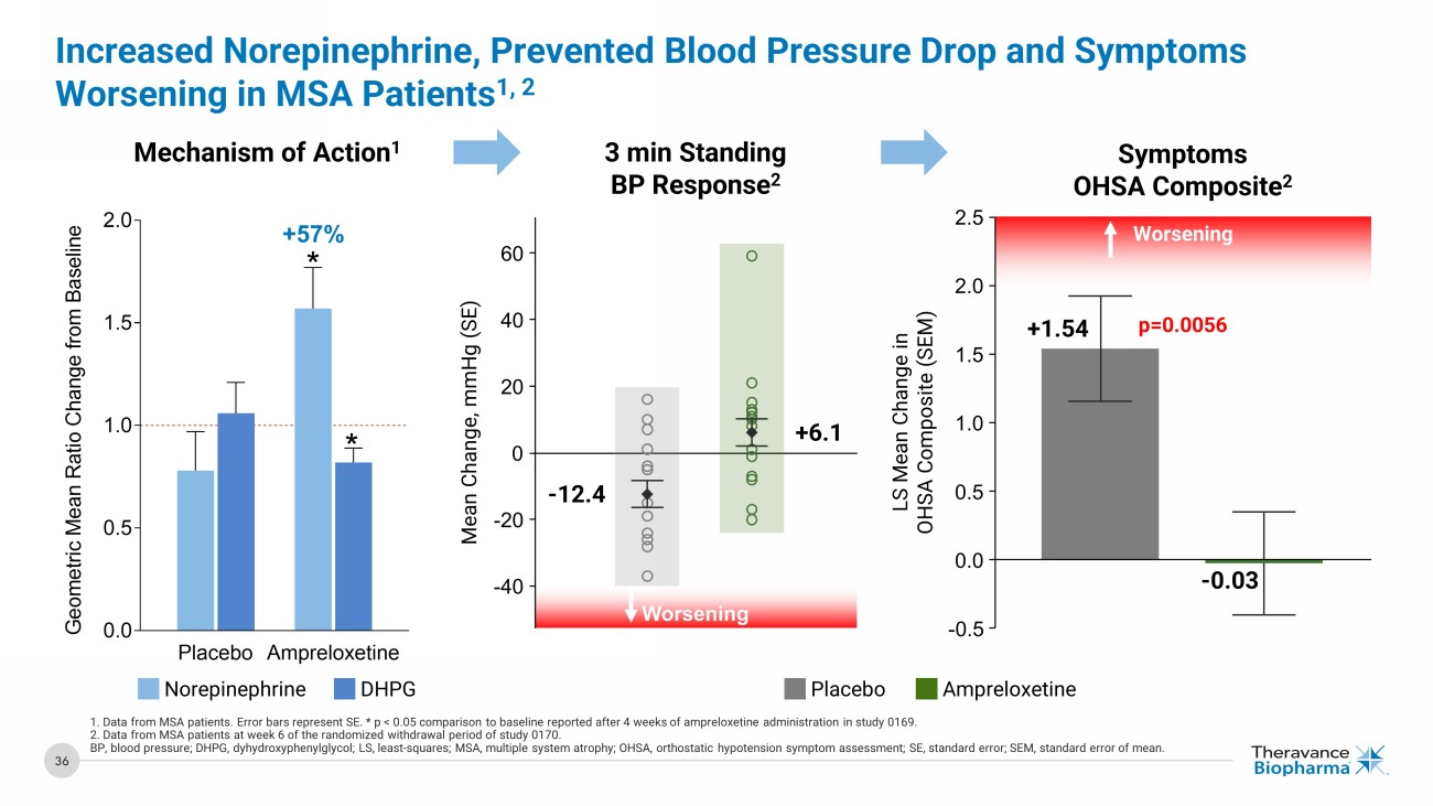 35 Durable, Clinically - significant Symptom Improvements in MSA Demonstrated in Initial Phase 3 Program CI, confidence interval; DB, double - blind; MSA, multiple system atrophy; OHSA, orthostatic hypotension symptom assessment; OL, o pen label; RW, randomized withdrawal. BL1 2 3 4 0 2 4 6 8 BL 4 8 12 16 BL 18 20 22 time (weeks) OHSA Composite Score Mean (95% CI) Placebo Ampreloxetine 33 33 20 18 34 32 20 20 64 42 n, Placebo n, Ampreloxetine BL, Baseline 0169 DB 0170 OL 0170 RW
