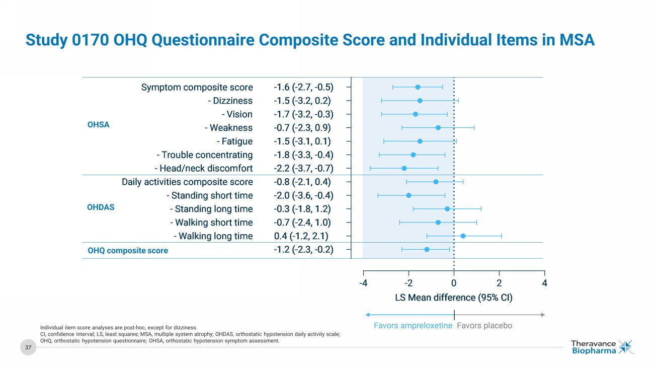 36 Increased Norepinephrine, Prevented Blood Pressure Drop and Symptoms Worsening in MSA Patients 1, 2 1. Data from MSA patients. Error bars represent SE. * p < 0.05 comparison to baseline reported after 4 weeks of ampreloxetine administration in study 0169. 2. Data from MSA patients at week 6 of the randomized withdrawal period of study 0170. BP, blood pressure; DHPG, dyhydroxyphenylglycol ; LS, least - squares; MSA, multiple system atrophy; OHSA, orthostatic hypotension symptom assessment; SE, standard error; SEM, st andard error of mean. 36 Placebo Ampreloxetine 0.0 0.5 1.0 1.5 2.0 G e o m e t r i c M e a n R a t i o C h a n g e f r o m B a s e l i n e Mechanism of Action 1 3 min Standing BP Response 2 * * +57% - 0.03 p=0.0056 LS Mean Change in OHSA Composite (SEM) Worsening +1.54 Symptoms OHSA Composite 2 0.0 - 0.5 0.5 1.0 1.5 2.0 2.5 - 40 - 20 0 20 40 60 Worsening - 12.4 +6.1 Mean Change, mmHg (SE) Placebo Ampreloxetine Norepinephrine DHPG