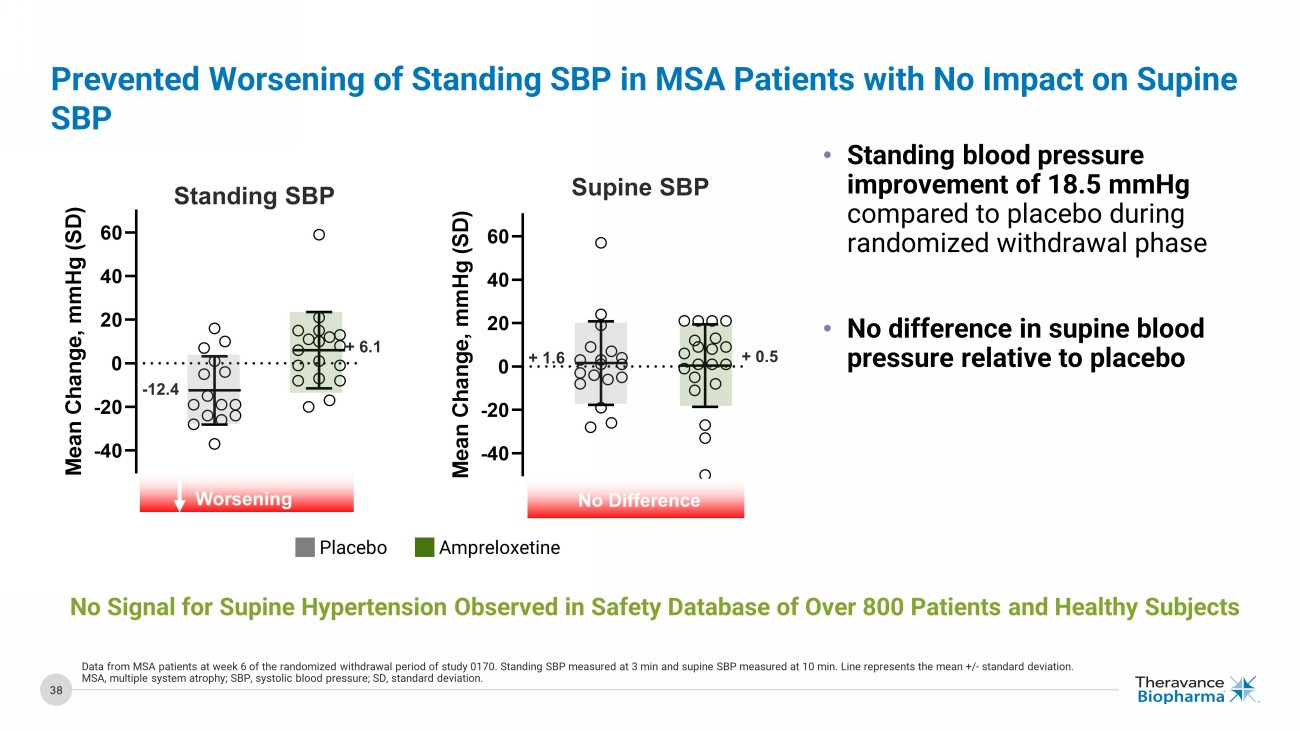 37 Study 0170 OHQ Questionnaire Composite Score and Individual Items in MSA Individual item score analyses are post - hoc, except for dizziness. CI, confidence interval; LS, least squares; MSA, multiple system atrophy; OHDAS, orthostatic hypotension daily activity scale ; OHQ, orthostatic hypotension questionnaire; OHSA, orthostatic hypotension symptom assessment. -4 -2 0 2 4 OHQ composite score - Walking long time - Walking short time - Standing long time - Standing short time Daily activities composite score - Head/neck discomfort - Trouble concentrating - Fatigue - Weakness - Vision - Dizziness Symptom composite score LS Mean difference (95% CI) -1.6 (-2.7, -0.5) -1.5 (-3.2, 0.2) -1.7 (-3.2, -0.3) -0.7 (-2.3, 0.9) -1.5 (-3.1, 0.1) -1.8 (-3.3, -0.4) -2.2 (-3.7, -0.7) -0.8 (-2.1, 0.4) -2.0 (-3.6, -0.4) -0.3 (-1.8, 1.2) -0.7 (-2.4, 1.0) 0.4 (-1.2, 2.1) -1.2 (-2.3, -0.2) OHSA OHDAS Favors ampreloxetine Favors placebo OHQ composite score
