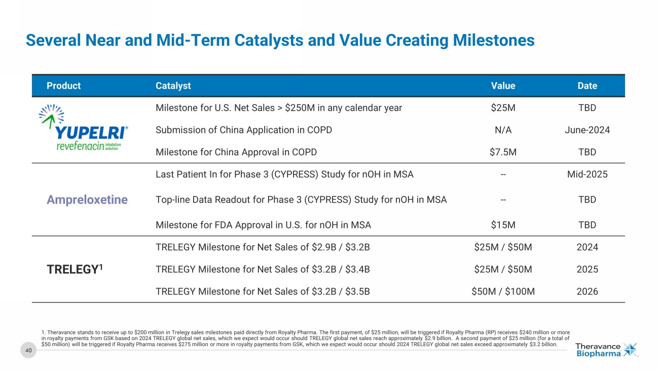 40 Several Near and Mid - Term Catalysts and Value Creating Milestones Product Catalyst Value Date Milestone for U.S. Net Sales > $250M in any calendar year $25M TBD Submission of China Application in COPD N/A June - 2024 Milestone for China Approval in COPD $7.5M TBD Ampreloxetine Last Patient In for Phase 3 (CYPRESS) Study for nOH in MSA -- Mid - 2025 Top - line Data Readout for Phase 3 (CYPRESS) Study for nOH in MSA -- TBD Milestone for FDA Approval in U.S. for nOH in MSA $15M TBD TRELEGY 1 TRELEGY Milestone for Net Sales of $2.9B / $3.2B $25M / $50M 2024 TRELEGY Milestone for Net Sales of $3.2B / $3.4B $25M / $50M 2025 TRELEGY Milestone for Net Sales of $3.2B / $3.5B $50M / $100M 2026 1. Theravance stands to receive up to $200 million in Trelegy sales milestones paid directly from Royalty Pharma. The first payment, of $25 million, will be triggered if Royalty Pharma (R P) receives $240 million or more in royalty payments from GSK based on 2024 TRELEGY global net sales, which we expect would occur should TRELEGY global net sa les reach approximately $2.9 billion. A second payment of $25 million (for a total of $50 million) will be triggered if Royalty Pharma receives $275 million or more in royalty payments from GSK, which we expect wou ld occur should 2024 TRELEGY global net sales exceed approximately $3.2 billion.