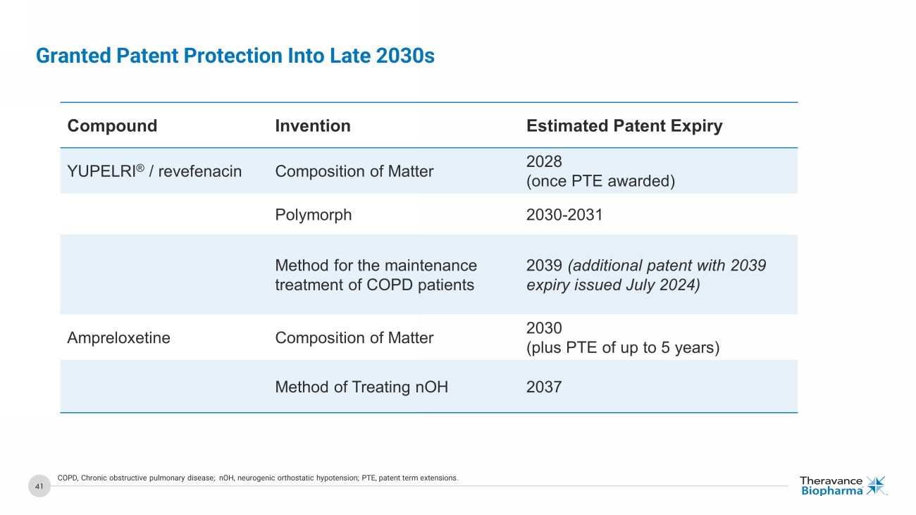 41 COPD, Chronic obstructive pulmonary disease; nOH, neurogenic orthostatic hypotension; PTE, patent term extensions. 41 Granted Patent Protection Into Late 2030s Compound Invention Estimated Patent Expiry YUPELRI ® / revefenacin Composition of Matter 2028 (once PTE awarded) Polymorph 2030 - 2031 Method for the maintenance treatment of COPD patients 2039 (additional patent with 2039 expiry issued July 2024) Ampreloxetine Composition of Matter 2030 (plus PTE of up to 5 years) Method of Treating nOH 2037