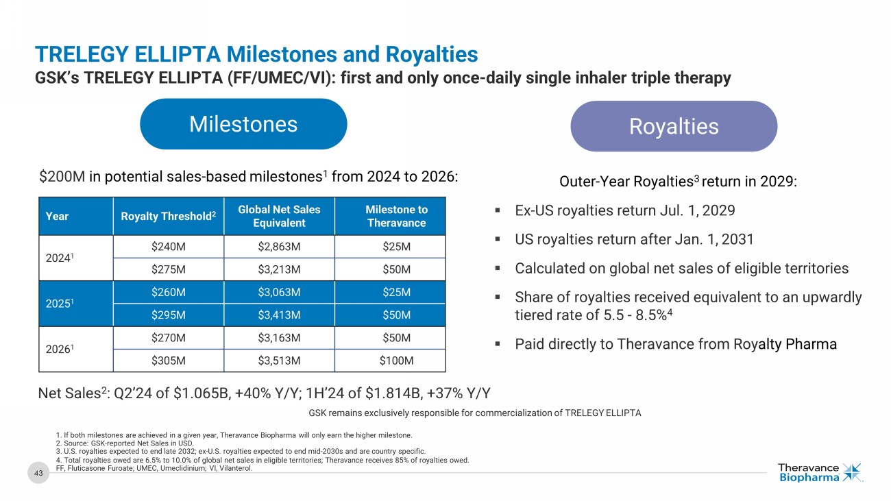 43 Net Sales 2 : Q2’24 of $1.065B, +40% Y/Y ; 1H’24 of $1.814B, +37% Y/Y Outer - Year Royalties 3 return in 2029: ▪ Ex - US royalties return Jul. 1, ௗ 2029 ▪ US royalties return after Jan. 1, ௗ 2031 ▪ Calculated on global net sales of eligible territories ▪ Share of royalties received equivalent to an upwardly tiered rate of 5.5 - 8.5% 4 ▪ Paid directly to Theravance from Roy alty Pharma TRELEGY ELLIPTA Milestones and Royalties GSK’s TRELEGY ELLIPTA (FF/UMEC/VI): first and only once - daily single inhaler triple therapy 1. If both milestones are achieved in a given year, Theravance Biopharma will only earn the higher milestone. 2. Source: GSK - reported Net Sales in USD. 3. U.S. royalties expected to end late 2032; ex - U.S. royalties expected to end mid - 2030s and are country specific. 4. Total royalties owed are 6.5% to 10.0% of global net sales in eligible territories; Theravance receives 85% of royalties o wed . FF, Fluticasone Furoate; UMEC, Umeclidinium; VI, Vilanterol. 43 Milestones Royalties $200M in potential sales - based milestones 1 from 2024 to 2026: GSK remains exclusively responsible for commercialization of TRELEGY ELLIPTA Year Royalty Threshold 2 Global Net Sales Equivalent Milestone to Theravance 2024 1 $240M $2,863M $25M $275M $3,213M $50M 2025 1 $260M $3,063M $25M $295M $3,413M $50M 2026 1 $270M $3,163M $50M $305M $3,513M $100M