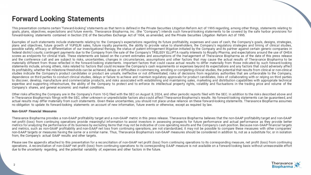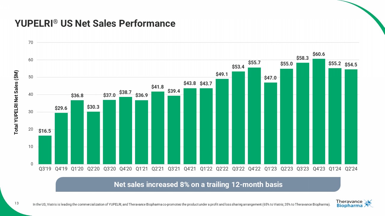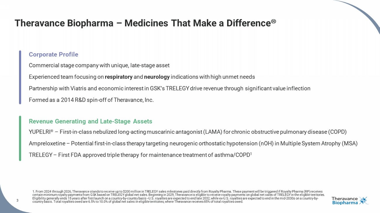2 Forward Looking Statements This presentation contains certain "forward - looking" statements as that term is defined in the Private Securities Litigation Reform Act of 1995 regarding, among other things, statements relating to goals, plans, objectives, expectations and future events . Theravance Biopharma, Inc . (the “Company”) intends such forward - looking statements to be covered by the safe harbor provisions for forward - looking statements contained in Section 21 E of the Securities Exchange Act of 1934 , as amended, and the Private Securities Litigation Reform Act of 1995 . Examples of such statements include statements relating to : the Company’s expectations regarding its future profitability, expenses and uses of cash, the Company’s goals, designs, strategies, plans and objectives, future growth of YUPELRI sales, future royalty payments, the ability to provide value to shareholders, the Company’s regulatory strategies and timing of clinical studies, possible safety, efficacy or differentiation of our investigational therapy, the status of patent infringement litigation initiated by the Company and its partner against certain generic companies in federal district courts ; contingent payments due to the Company from the sale of the Company’s TRELEGY ELLIPTA royalty interests to Royalty Pharma, and expectations around the use of OHSA scores as endpoints for clinical trials . These statements are based on the current estimates and assumptions of the management of Theravance Biopharma as of the date of this press release and the conference call and are subject to risks, uncertainties, changes in circumstances, assumptions and other factors that may cause the actual results of Theravance Biopharma to be materially different from those reflected in the forward - looking statements . Important factors that could cause actual results to differ materially from those indicated by such forward - looking statements include, among others, risks related to : factors that could increase the Company’s cash requirements or expenses beyond its expectations and any factors that could adversely affect its profitability, whether the milestone thresholds can be achieved, delays or difficulties in commencing, enrolling or completing clinical studies, the potential that results from clinical or non - clinical studies indicate the Company’s product candidates or product are unsafe, ineffective or not differentiated, risks of decisions from regulatory authorities that are unfavorable to the Company, dependence on third parties to conduct clinical studies, delays or failure to achieve and maintain regulatory approvals for product candidates, risks of collaborating with or relying on third parties to discover, develop, manufacture and commercialize products, and risks associated with establishing and maintaining sales, marketing and distribution capabilities with appropriate technical expertise and supporting infrastructure, the ability of the Company to protect and to enforce its intellectual property rights, volatility and fluctuations in the trading price and volume of the Company’s shares, and general economic and market conditions . Other risks affecting the Company are in the Company’s Form 10 - Q filed with the SEC on August 8 , 2024 , and other periodic reports filed with the SEC . In addition to the risks described above and in Theravance Biopharma's filings with the SEC, other unknown or unpredictable factors also could affect Theravance Biopharma’s results . No forward - looking statements can be guaranteed, and actual results may differ materially from such statements . Given these uncertainties, you should not place undue reliance on these forward - looking statements . Theravance Biopharma assumes no obligation to update its forward - looking statements on account of new information, future events or otherwise, except as required by law . Non - GAAP Financial Measures Theravance Biopharma provides a non - GAAP profitability target and a non - GAAP metric in this press release . Theravance Biopharma believes that the non - GAAP profitability target and non - GAAP net profit (loss) from continuing operations provide meaningful information to assist investors in assessing prospects for future performance and actual performance as they provide better metrics for analyzing the performance of its business by excluding items that may not be indicative of core operating results and the Company's cash position . Because non - GAAP financial targets and metrics, such as non - GAAP profitability and non - GAAP net loss from continuing operations, are not standardized, it may not be possible to compare these measures with other companies' non - GAAP targets or measures having the same or a similar name . Thus, Theravance Biopharma's non - GAAP measures should be considered in addition to, not as a substitute for, or in isolation from, the Company's actual GAAP results and other targets . Please see the appendix attached to this presentation for a reconciliation of non - GAAP net profit (loss) from continuing operations to its corresponding measure, net profit (loss) from continuing operations . A reconciliation of non - GAAP net profit (loss) from continuing operations to its corresponding GAAP measure is not available on a forward - looking basis without unreasonable effort due to the uncertainty regarding, and the potential variability of, expenses and other factors in the future .