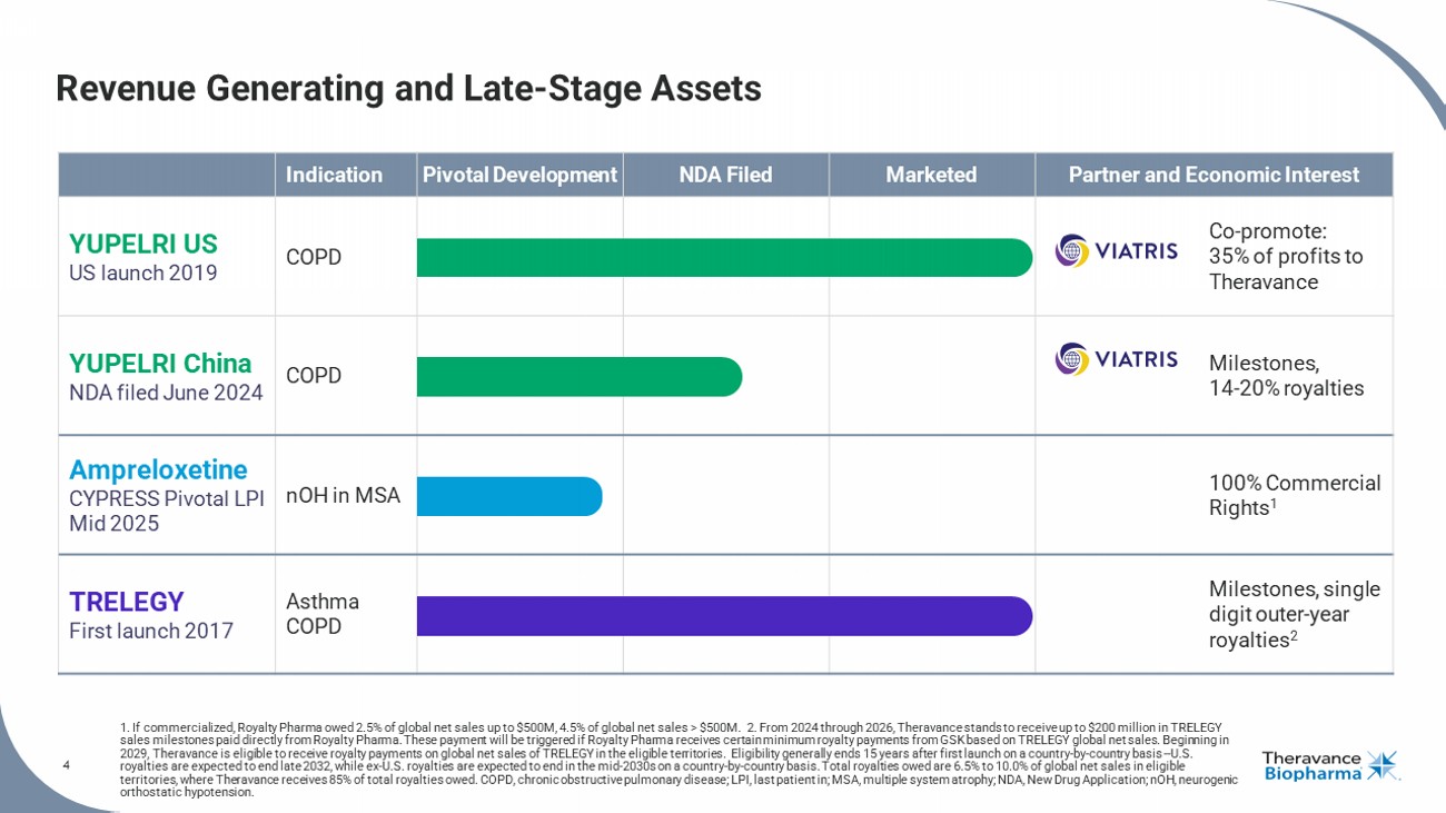 3 Theravance Biopharma – Medicines That Make a Difference  YUPELR I  – First - in - class nebulized long - acting muscarinic antagonist (LAMA) for chronic obstructive pulmonary disease (COPD) Ampreloxetine – Potential first - in - class therapy targeting neurogenic orthostatic hypotension ( nOH ) in Multiple System Atrophy (MSA) TRELEGY – First FDA approved triple therapy for maintenance treatment of asthma/COPD 1 Commercial stage company with unique, late - stage asset Experienced team focusing on respiratory and neurology indications with high unmet needs Partnership with Viatris and economic interest in GSK’s TRELEGY drive revenue through significant value inflection Formed as a 2014 R&D spin - off of Theravance, Inc. Revenue Generating and Late - Stage Assets Corporate Profile 1. From 2024 through 2026, Theravance stands to receive up to $200 million in TRELEGY sales milestones paid directly from Royalty Pharma. These payment will be tri gg ered if Royalty Pharma (RP) receives certain minimum royalty payments from GSK based on TRELEGY global net sales. Beginning in 2029, Theravance is eligible to receive royalty payments on global net sales of TRELEGY in the eligible territories. Eligibility generally ends 15 years after first launch on a country - by - country basis -- U.S. royalties are expected to end late 2 032, while ex - U.S. royalties are expected to end in the mid - 2030s on a country - by - country basis. Total royalties owed are 6.5% to 10.0% of global net sales in eligible territories, where Theravance receives 85% of total royalties owed.