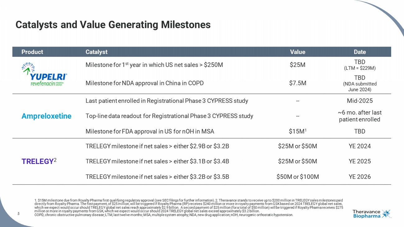 4 Partner and Economic Interest Marketed NDA Filed Pivotal Development Indication Co - promote: 35% of profits to Theravance COPD YUPELRI US US launch 2019 Milestones, 14 - 20% royalties COPD YUPELRI China NDA filed June 2024 100% Commercial Rights 1 nOH in MSA Ampreloxetine CYPRESS Pivotal LPI Mid 2025 Milestones, single digit outer - year royalties 2 Asthma COPD TRELEGY First launch 2017 Revenue Generating and Late - Stage Assets 1. If commercialized, Royalty Pharma owed 2.5% of global net sales up to $500M, 4.5% of global net sales > $500M. 2. From 20 24 through 2026, Theravance stands to receive up to $200 million in TRELEGY sales milestones paid directly from Royalty Pharma. These payment will be triggered if Royalty Pharma receives certain minimu m r oyalty payments from GSK based on TRELEGY global net sales. Beginning in 2029, Theravance is eligible to receive royalty payments on global net sales of TRELEGY in the eligible territories. Eligibi lit y generally ends 15 years after first launch on a country - by - country basis -- U.S. royalties are expected to end late 2032, while ex - U.S. royalties are expected to end in the mid - 2030s on a country - by - country ba sis. Total royalties owed are 6.5% to 10.0% of global net sales in eligible territories, where Theravance receives 85% of total royalties owed. COPD, chronic obstructive pulmonary disease; LPI, last pa tie nt in; MSA, multiple system atrophy; NDA, New Drug Application; nOH , neurogenic orthostatic hypotension. 4