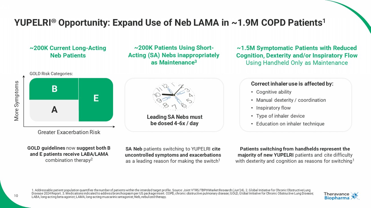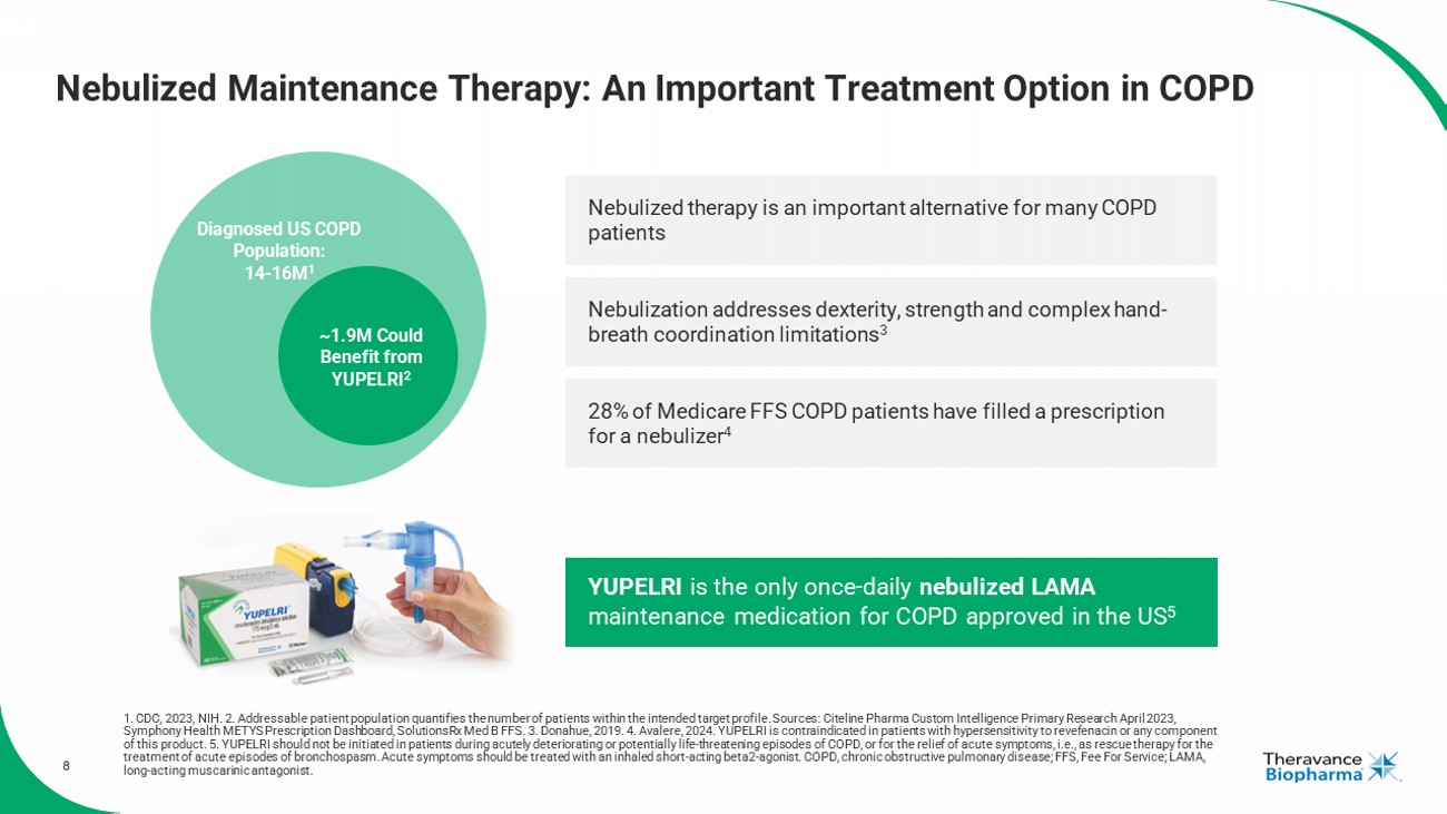 44 About YUPELRI ® ( revefenacin ) Inhalation Solution YUPELRI ® ( revefenacin ) inhalation solution is a once - daily nebulized LAMA approved for the maintenance treatment of COPD in the US . Market research by Theravance Biopharma indicates approximately 9 % of the treated COPD patients in the US use nebulizers for ongoing maintenance therapy . 1 LAMAs are a cornerstone of maintenance therapy for COPD and YUPELRI ® is positioned as the first once - daily single - agent bronchodilator product for COPD patients who require, or prefer, nebulized therapy . YUPELRI ® ’s stability in both metered dose inhaler and dry powder device formulations suggest that this LAMA could also serve as a foundation for novel handheld combination products . 1. TBPH market research (N=160 physicians); refers to US COPD patients. COPD, chronic obstructive pulmonary disease; LAMA, long - acting muscarinic antagonist. 44