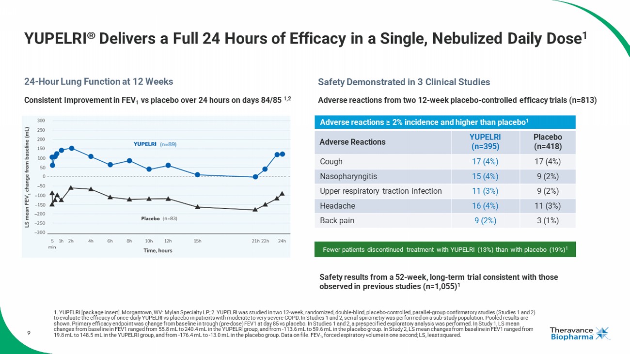 8 Nebulized therapy is an important alternative for many COPD patients 8 Nebulized Maintenance Therapy: An Important Treatment Option in COPD 1. CDC, 2023, NIH. 2. Addressable patient population quantifies the number of patients within the intended target profile. So urc es: Citeline Pharma Custom Intelligence Primary Research April 2023, Symphony Health METYS Prescription Dashboard, SolutionsRx Med B FFS. 3. Donahue, 2019. 4. Avalere, 2024. YUPELRI is contraindicated in patients with hypersensitivity to revefenacin or any component of this product. 5. YUPELRI should not be initiated in patients during acutely deteriorating or potentially life - threatening epi sodes of COPD, or for the relief of acute symptoms, i.e., as rescue therapy for the treatment of acute episodes of bronchospasm. Acute symptoms should be treated with an inhaled short - acting beta2 - agonist. COPD, chronic obstructive pulmonary disease; FFS, Fee For Service; LAMA, long - acting muscarinic antagonist. Nebulization addresses dexterity, strength and complex hand - breath coordination limitations 3 ~1.9M Could Benefit from YUPELRI 2 Diagnosed US COPD Population: 14 - 16M 1 YUPELRI is the only once - daily nebulized LAMA maintenance medication for COPD approved in the US 5 28% of Medicare FFS COPD patients have filled a prescription for a nebulizer 4