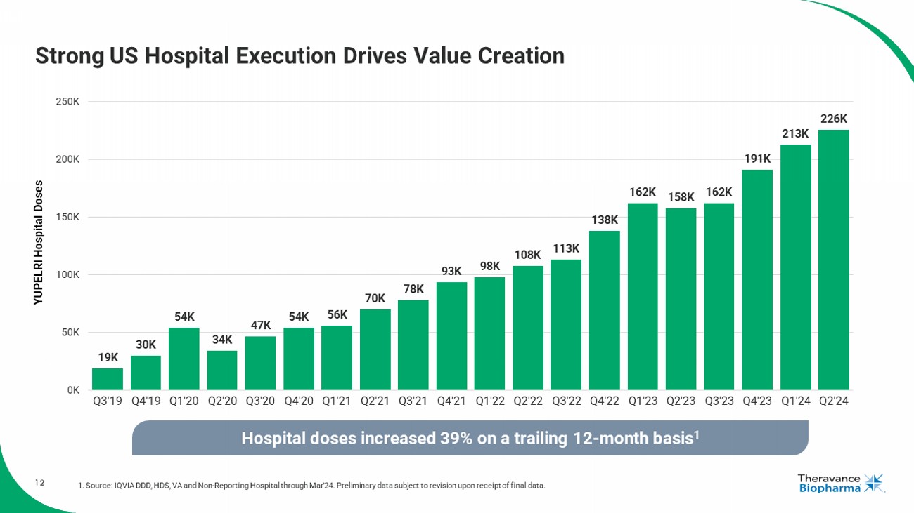 11 Theravance / Viatris Partnership Drives YUPELRI  Prescription Growth US Co - Promotion Agreement (35% / 65% Profit Share) Community (Doctor’s Office) Hospital MD starts YUPELRI Community MD starts YUPELRI Hospital starts make a sizeable contribution to the business • >80% of patients receiving YUPELRI in the hospital leave with a script to continue therapy • Theravance and Viatris coordinate with caregivers to ensure smooth Transition of Care Patients continue YUPELRI YUPELRI candidate experiences symptoms or exacerbation Fulfillment (Pharmacy, DME) PHARMACY Calls on community caregiver Calls on hospital caregiver