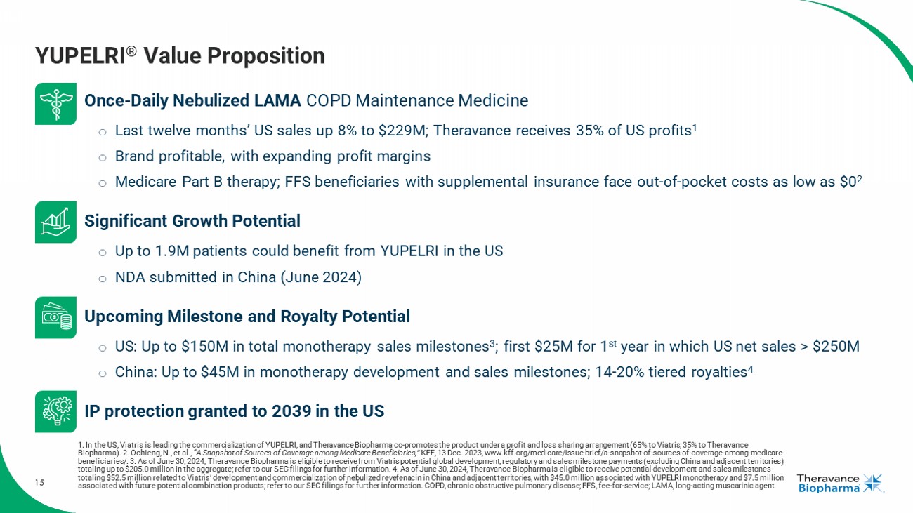 14 The YUPELRI ® China Opportunity NDA Filed June 2024 Viatris is the 8 th largest multinational company in China, with a sales force of ~4,200 covering >70K hospitals and 400K pharmacies in over 300 cities 5 #2 pharmaceutical market globally 1 Nearly 100M individuals with COPD; ~43% suffer from moderate to severe disease 2,3 15 - month median NDA/BLA review time (2023 to present) 4 Economics 6 $7.5M milestone on approval $37.5M of sales milestones 14 - 20% tiered royalties Opportunity 1. IQVIA Institute Global Use of Medicines 2024. 2. Wang C, Xu, J, Yang L, et al., The Lancet, 2018. 3. Yin P, Wang H, Vos T, et al., Chest, 2013. 4. Baipharm Monthly Report: New Drug Approvals, internal analysis (Jan ’23 – May ’24). 5. Source: Viatris (2021). 6. As of June 30, 2024, Theravance Biopharma is eligible to receive potential development and sales milestones totali ng $52.5 million related to Viatris ’ development and commercialization of nebulized revefenacin in China and adjacent territories, with $45.0 million associated with YUPELRI monotherapy and $7.5 million associated with fu tu re potential combination products; refer to our SEC filings for further information. BLA, Biologics License Application; NDA, New Drug App lic ation; COPD, chronic obstructive pulmonary disease.