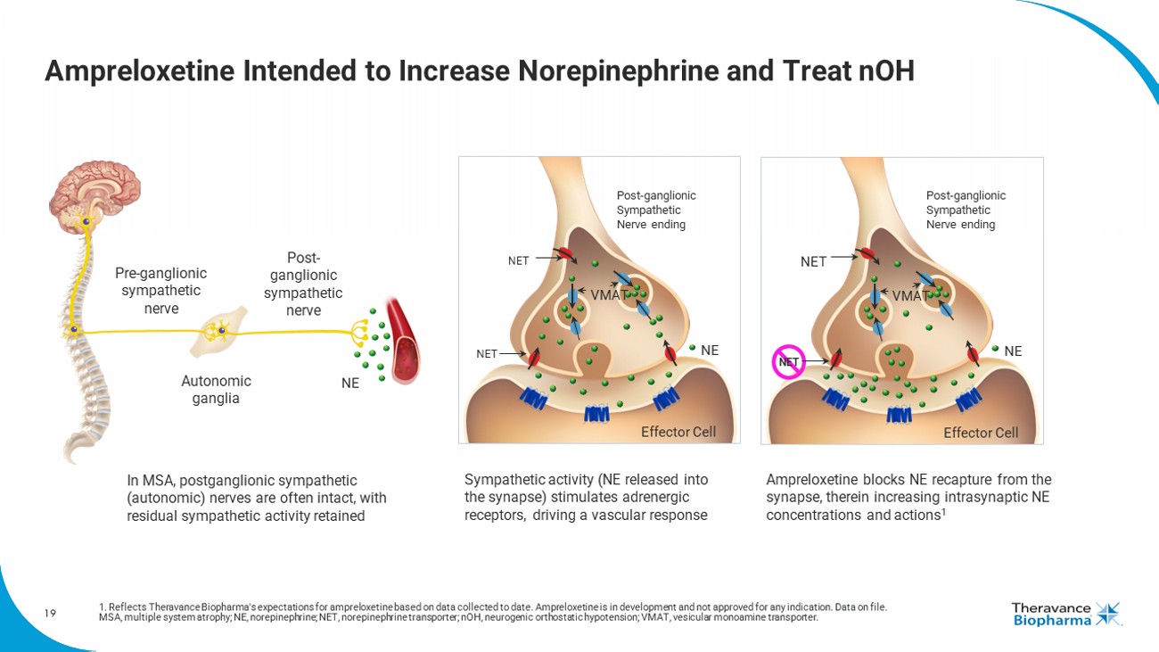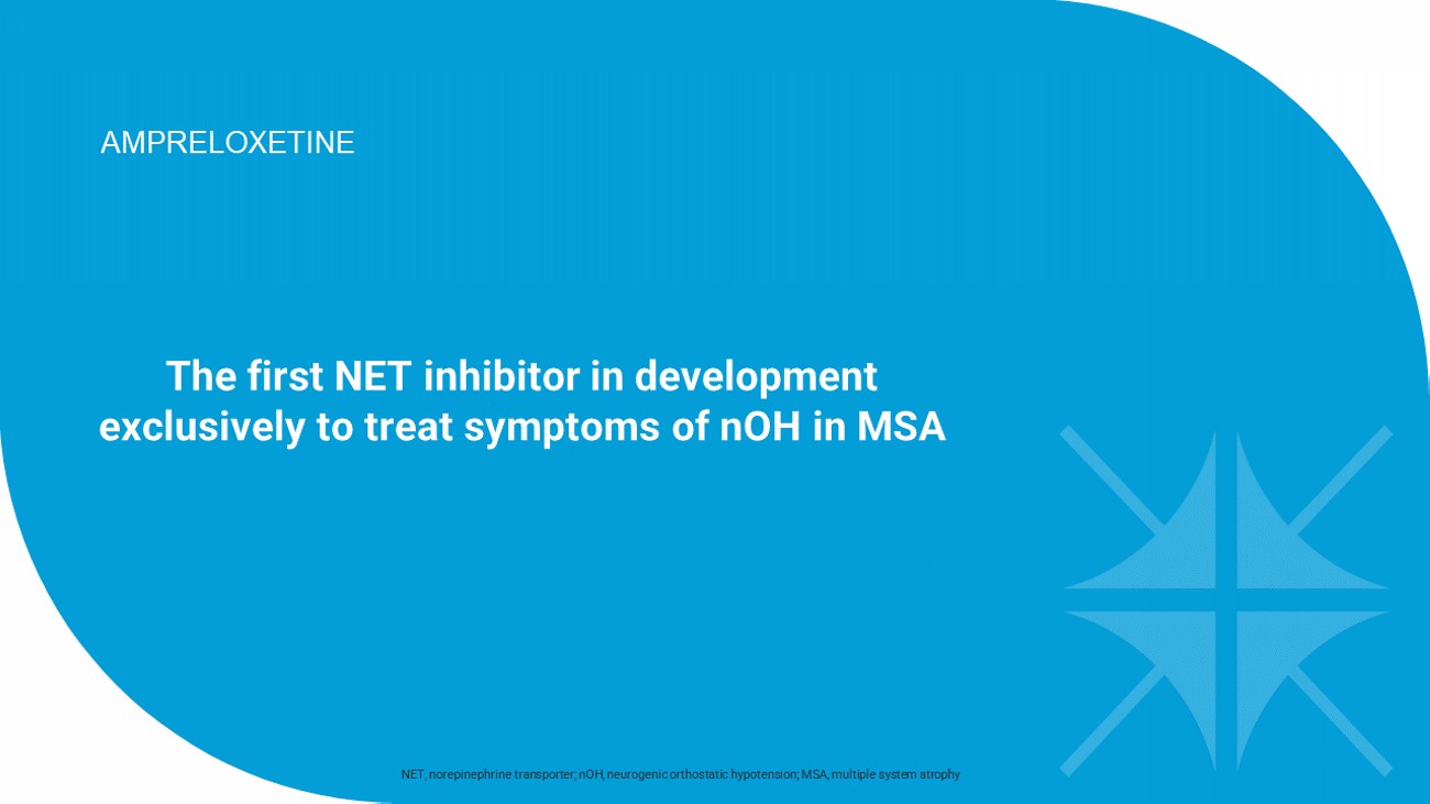 The first NET inhibitor in development exclusively to treat symptoms of nOH in MSA NET, norepinephrine transporter; nOH , neurogenic orthostatic hypotension ; MSA, multiple system atrophy AMPRELOXETINE