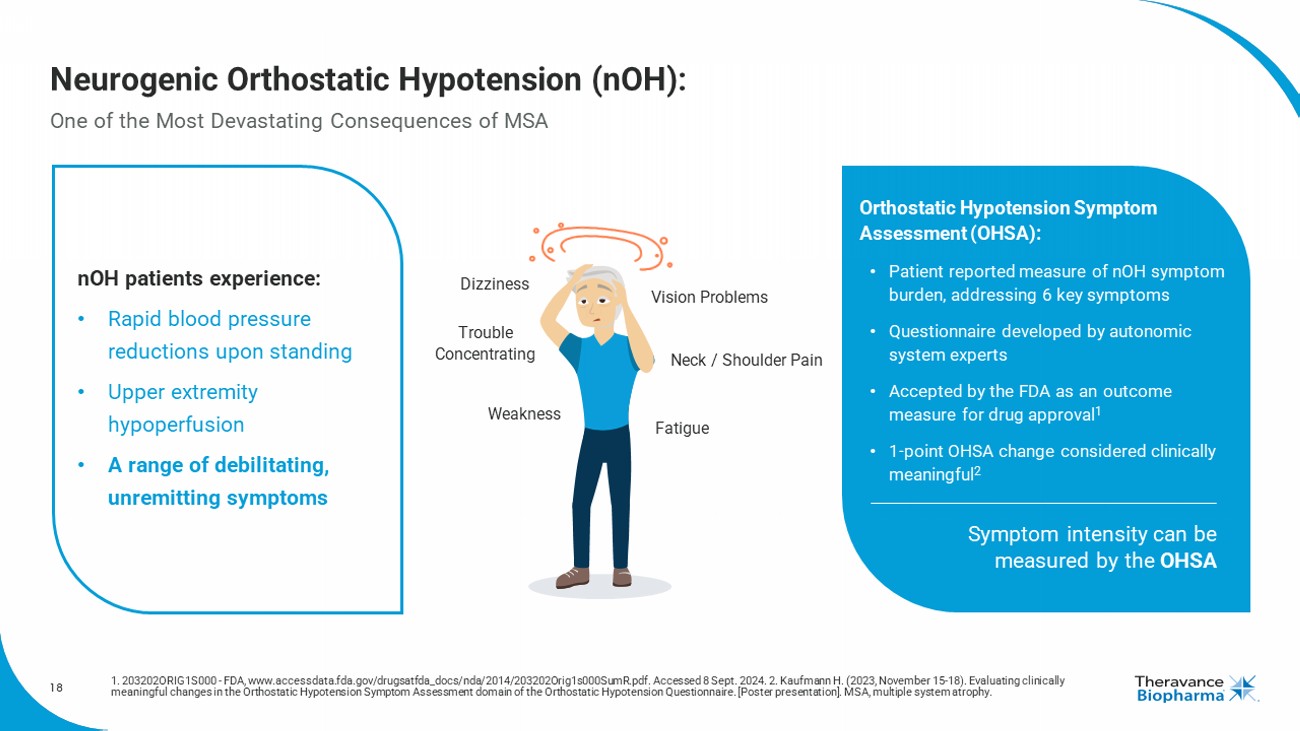 18 Neurogenic Orthostatic Hypotension ( nOH ): One of the Most Devastating Consequences of MSA 1. 203202ORIG1S000 - FDA, www.accessdata.fda.gov/drugsatfda_docs/nda/2014/203202Orig1s000SumR.pdf. Accessed 8 Sept. 2024. 2. Kau fmann H. (2023, November 15 - 18). Evaluating clinically meaningful changes in the Orthostatic Hypotension Symptom Assessment domain of the Orthostatic Hypotension Questionnaire. [Po ste r presentation]. MSA, multiple system atrophy. nOH patients experience: • R apid blood pressure reductions upon standing • U pper extremity hypoperfusion • A range of debilitating, unremitting symptoms Orthostatic Hypotension Symptom Assessment (OHSA): • Patient reported measure of nOH symptom burden, addressing 6 key symptoms • Questionnaire developed by autonomic system experts • Accepted by the FDA as an outcome measure for drug approval 1 • 1 - point OHSA change considered clinically meaningful 2 Symptom intensity can be measured by the OHSA Dizziness Vision Problems Trouble Concentrating Neck / Shoulder Pain Weakness Fatigue