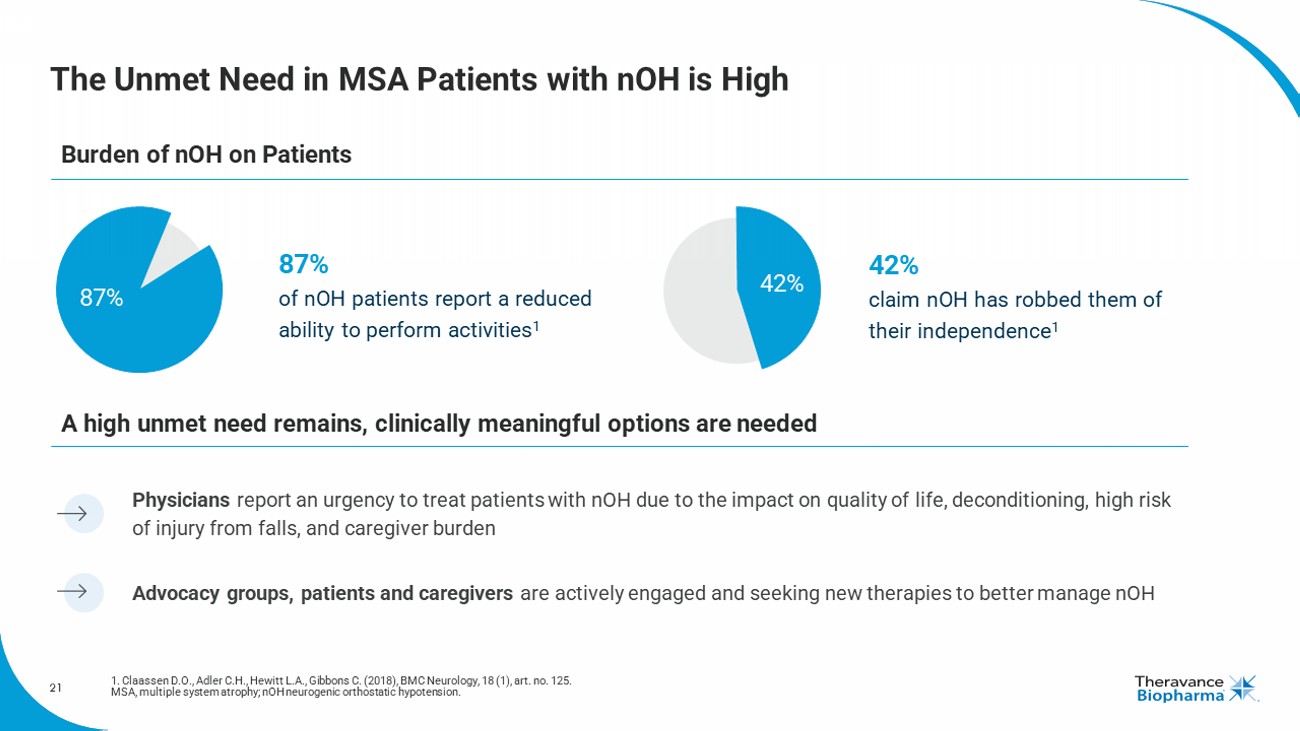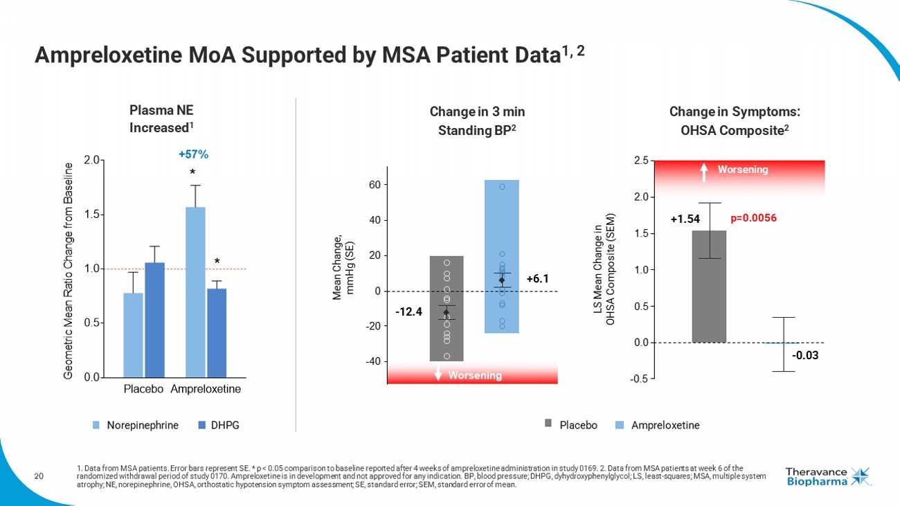 19 Ampreloxetine Intended to Increase Norepinephrine and Treat nOH Post - ganglionic sympathetic nerve Pre - ganglionic sympathetic nerve Autonomic ganglia NE Post - ganglionic Sympathetic Nerve ending NET NE VMAT Effector Cell NET Sympathetic activity ( NE released into the synapse) stimulates adrenergic receptors, driving a vascular response In MSA, postganglionic sympathetic (autonomic) nerves are often intact, with residual sympathetic activity retained Ampreloxetine blocks NE recapture from the synapse, therein increasing intrasynaptic NE concentrations and actions 1 Post - ganglionic Sympathetic Nerve ending NET NE VMAT Effector Cell NET 1. Reflects Theravance Biopharma's expectations for ampreloxetine based on data collected to date. Ampreloxetine is in development and not approved for any indication. Data on file. MSA, multiple system atrophy; NE, norepinephrine; NET, norepinephrine transporter; nOH , neurogenic orthostatic hypotension; VMAT, vesicular monoamine transporter.