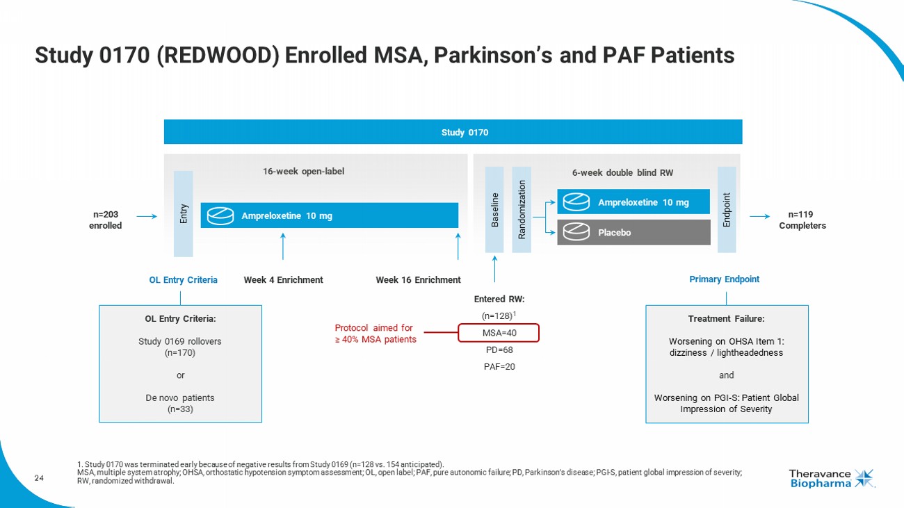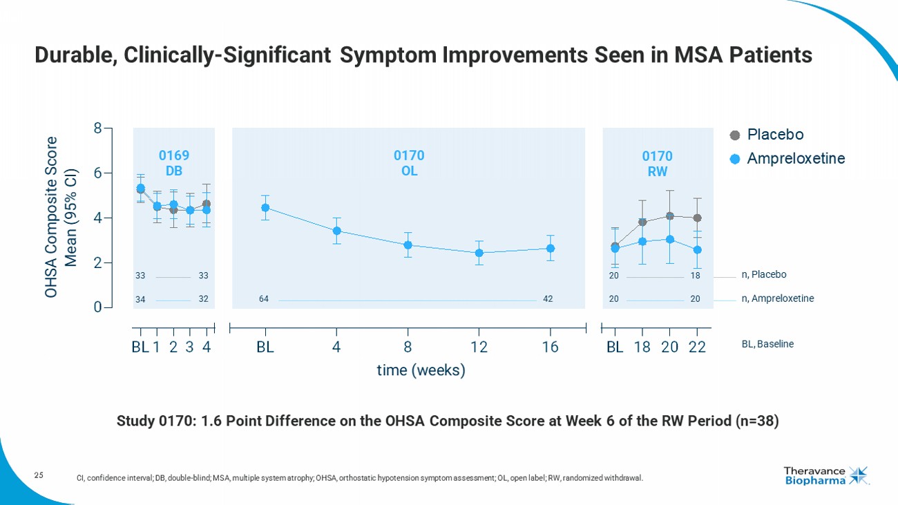24 Study 0170 (REDWOOD) Enrolled MSA, Parkinson’s and PAF Patients 1. Study 0170 was terminated early because of negative results from Study 0169 (n=128 vs. 154 anticipated). MSA, multiple system atrophy; OHSA, orthostatic hypotension symptom assessment; OL, open label; PAF, pure autonomic failure; PD, Parkinson’s disease; PGI - S, patient global impression of severity; RW, randomized withdrawal. OL Entry Criteria: Study 0169 rollovers (n=170) or De novo patients (n=33) Treatment Failure: Worsening on OHSA Item 1: dizziness / lightheadedness and Worsening on PGI - S: Patient Global Impression of Severity Entry Endpoint 6 - week double blind RW 16 - week open - label Baseline Randomization Ampreloxetine 10 mg Ampreloxetine 10 mg Placebo Week 16 Enrichment Entered RW: (n=128) 1 MSA=40 PD=68 PAF=20 Week 4 Enrichment Study 0170 Primary Endpoint Protocol aimed for ≥ 40% MSA patients n=119 Completers OL Entry Criteria n=203 enrolled