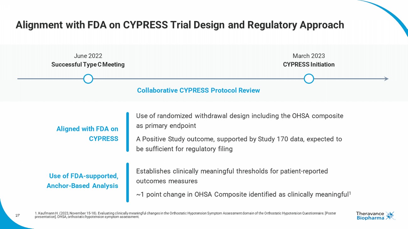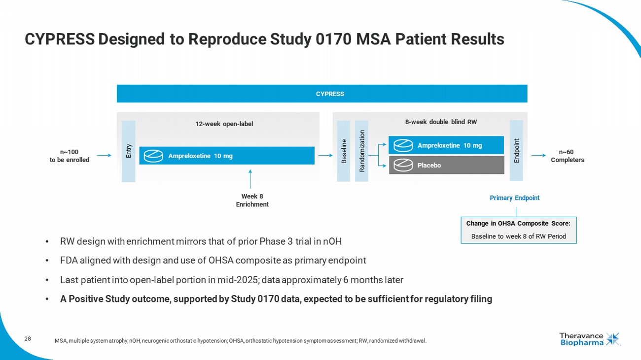 27 Alignment with FDA on CYPRESS Trial Design and Regulatory Approach 1. Kaufmann H. (2023, November 15 - 18). Evaluating clinically meaningful changes in the Orthostatic Hypotension Symptom Assessmen t domain of the Orthostatic Hypotension Questionnaire. [Poster presentation]. OHSA, orthostatic hypotension symptom assessment. Aligned with FDA on CYPRESS Use of FDA - supported, Anchor - Based Analysis June 2022 Successful Type C Meeting March 2023 CYPRESS Initiation Collaborative CYPRESS Protocol Review Use of r andomized withdrawal design including the OHSA composite as primary endpoint A Positive Study outcome, supported by Study 170 data, expected to be sufficient for regulatory filing Establishes clinically meaningful thresholds for patient - reported outcomes measures ~1 point change in OHSA Composite identified as clinically meaningful 1