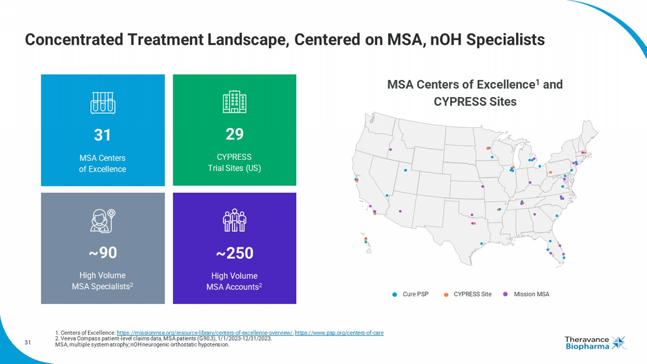 30 Prevalence in Europe 1,2 45 - 60K MSA Patients with nOH Prevalence in China & Japan 1 90 - 105K MSA Patients with nOH Ampreloxetine Global Opportunity Significant unmet needs in leading therapeutics markets 1. Thelansis nOH Market Report 2023; TBPH Internal Analysis. nOH graphics reflect the mid - point of the provided ranges . 2. Prevalence estimate for Germany , France , UK, Italy and Spain . MSA, multiple system atrophy ; nOH neurogenic orthostatic hypotension . ~ 40,000 ~ 53,000 ~ 98,000 MSA Patients w/ nOH MSA Patients w/ nOH Prevalence in United States 3 5 - 45K MSA Patients with nOH ~ 53,000 ~ 98,000 MSA Patients w/ nOH