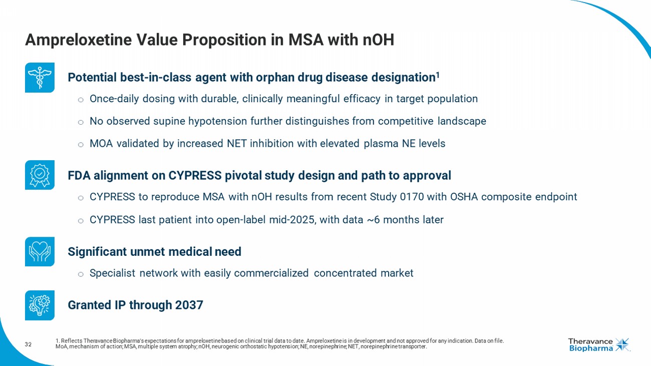 32 Ampreloxetine Value Proposition in MSA with nOH Potential best - in - class agent with orphan drug disease designation 1 o Once - daily dosing with durable, clinically meaningful efficacy in target population o No observed supine hypotension further distinguishes from competitive landscape o MOA validated by increased NET inhibition with elevated plasma NE levels FDA alignment on CYPRESS pivotal study design and path to approval o CYPRESS to reproduce MSA with nOH results from recent Study 0170 with OSHA composite endpoint o CYPRESS last patient into open - label mid - 2025, with data ~6 months later Significant unmet medical need o Specialist network with easily commercialized concentrated market Granted IP through 2037 1. Reflects Theravance Biopharma's expectations for ampreloxetine based on clinical trial data to date. Ampreloxetine is in development and not approved for any indication. Data on file. MoA , mechanism of action; MSA, multiple system atrophy; nOH , neurogenic orthostatic hypotension; NE, norepinephrine; NET, norepinephrine transporter.